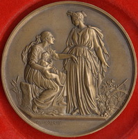 | Sur le revers de la médaille de Parmentier, l’artiste M. Cannois a représenté une femme assise, souffrante, tenant un enfant nu sur ses genoux.