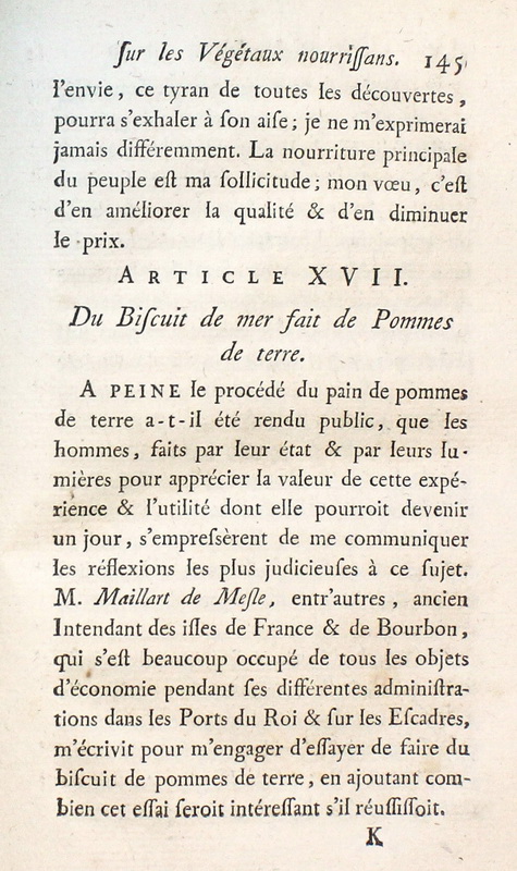 Article extrait des : Recherches sur les végétaux nourrissans ..., par M. Parmentier. Paris : imprimerie royale, 1781.