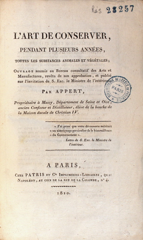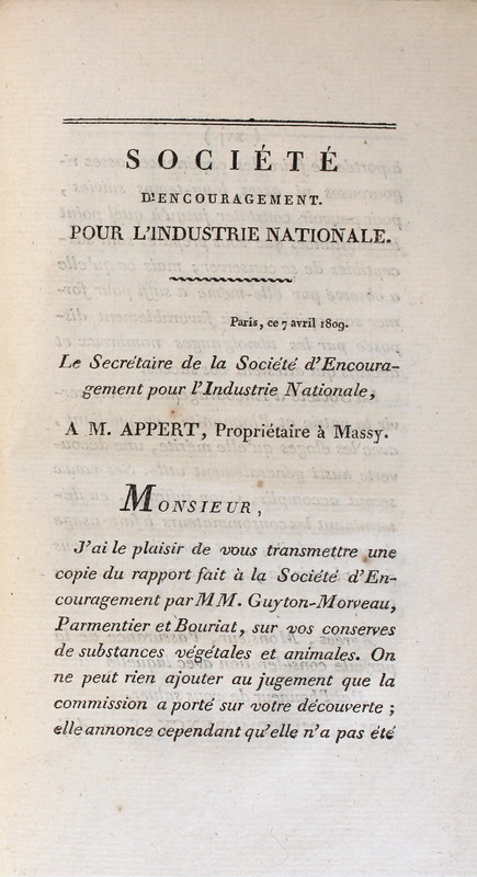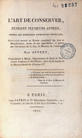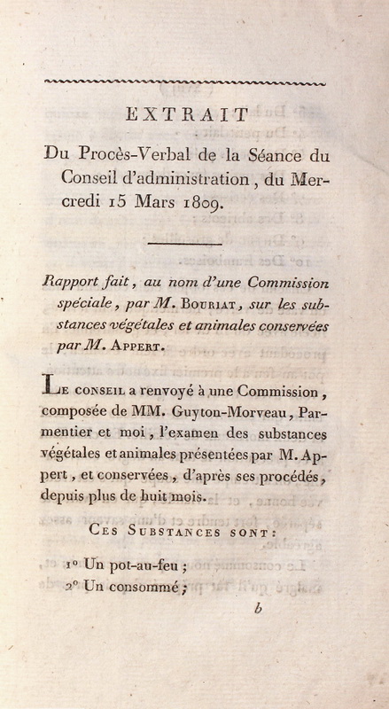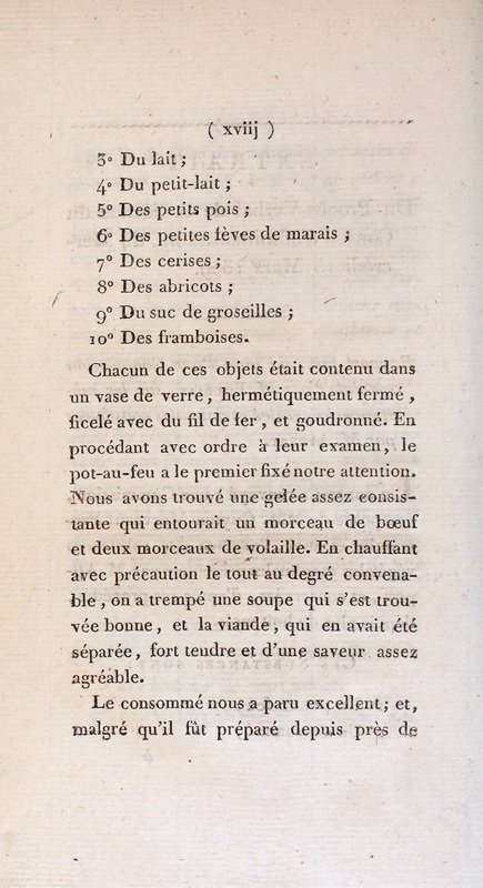 | Extrait de : L’Art de conserver, pendant plusieurs années, toutes les substances animales et végétales ..., par Nicolas Appert. Paris : Chez
