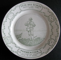 | Tout en célébrant la Fête des écoles de Neuilly, cette assiette célèbre la statue de Parmentier érigée par Gaudez en 1888, l'année même de sa