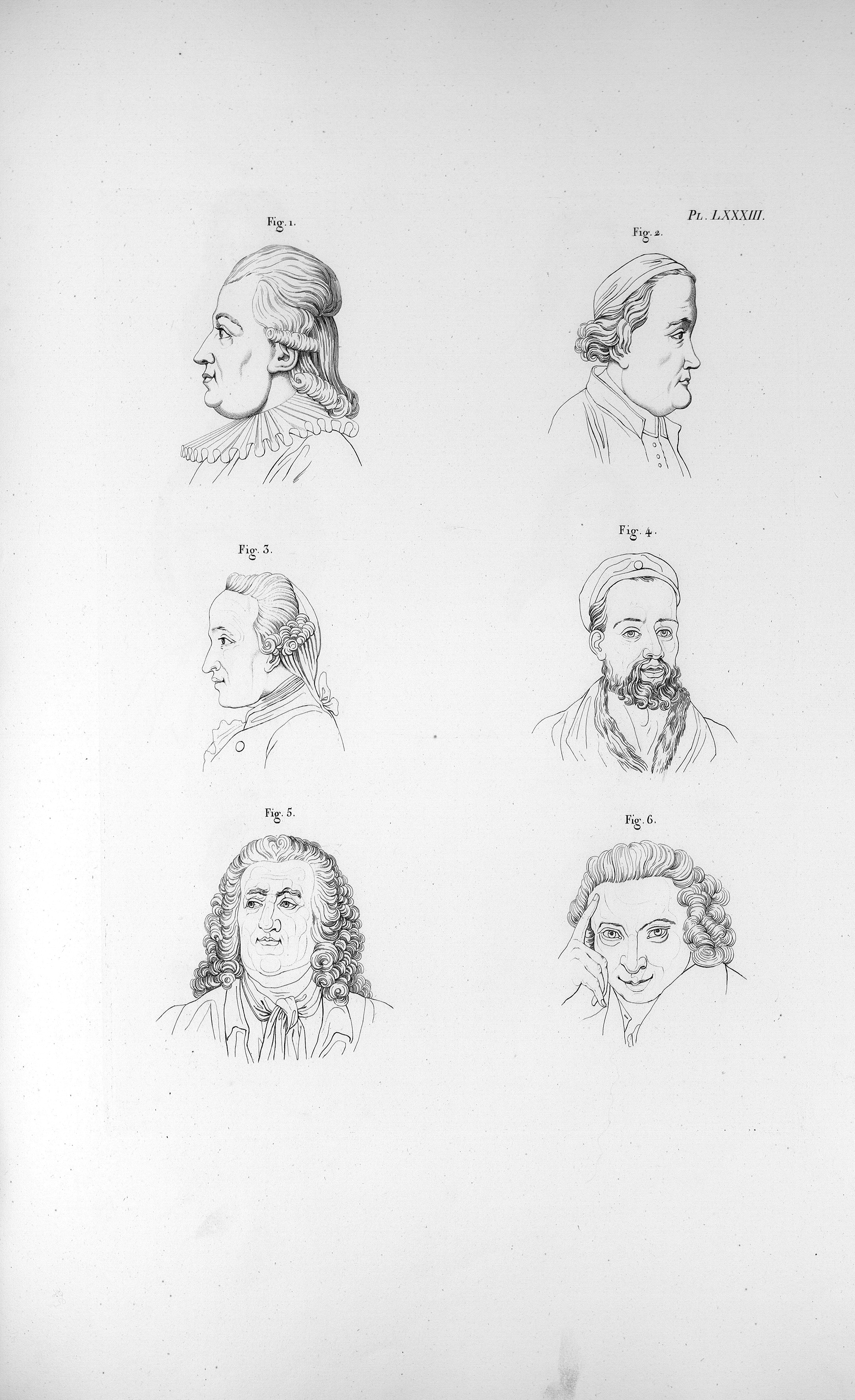 Pl. LXXXIII. Fig. 1. Hufnagel / Fig. 2. Baarhammer / Fig. 3. Kant / Fig. 4. Rabelais / Fig. 5. Piron / Fig. 6. Sterne - Anatomie et physiologie du système nerveux en général et du cerveau en particulier, avec des observations sur la possibilité de reconnaître plusieurs dispositions intellectuelles et morales de l'homme et des animaux par la configuration de leurs têtes. Atlas