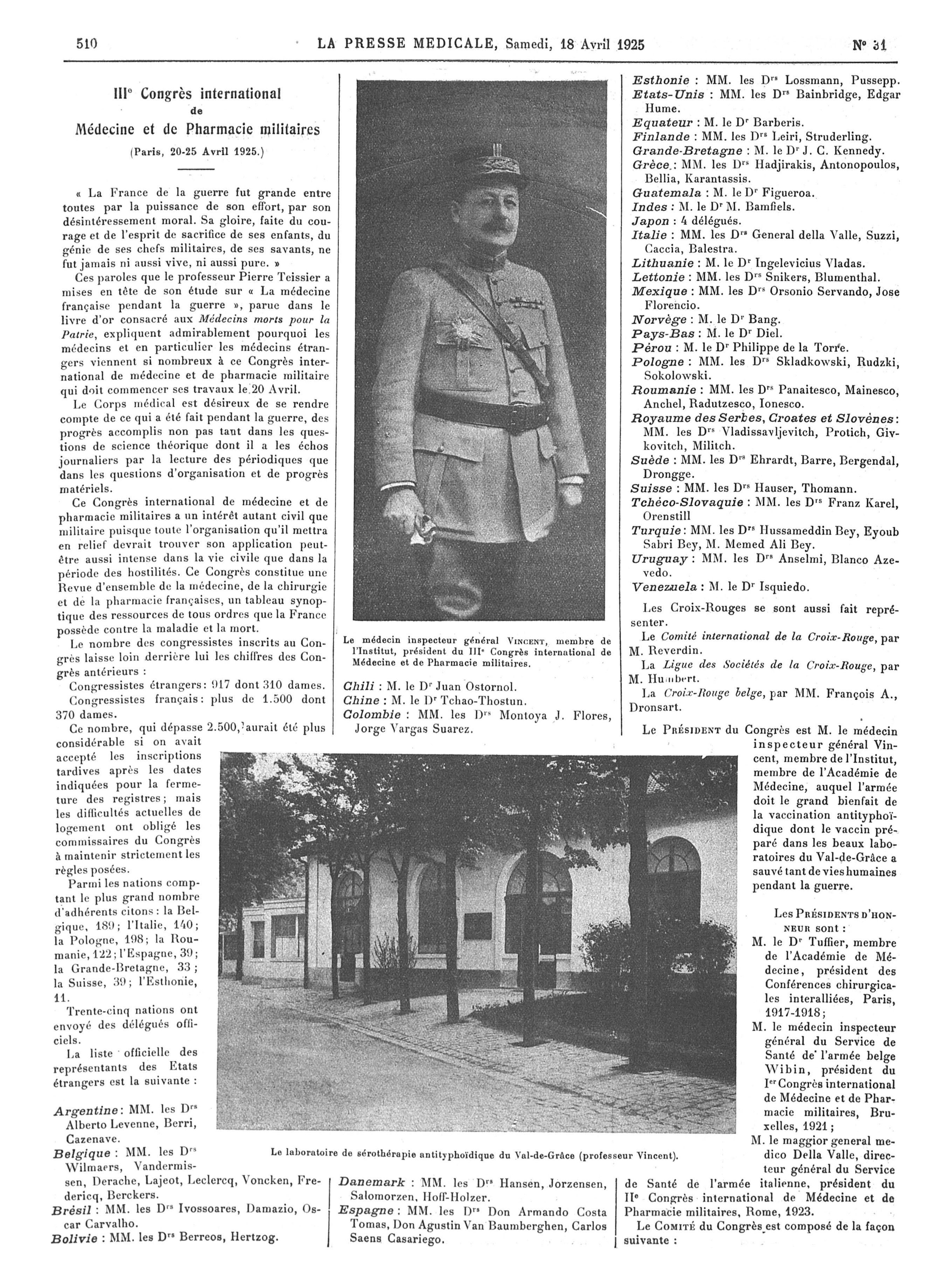 Le médecin inspecteur général Vincent, membre de l'Institut, président du IIIe Congrès international de médecine et de pharmacie militaires / Le laboratoire de sérothérapie antityphoïdique de Val-de-Grâce (professeur Vincent) - La Presse médicale - [Articles originaux]