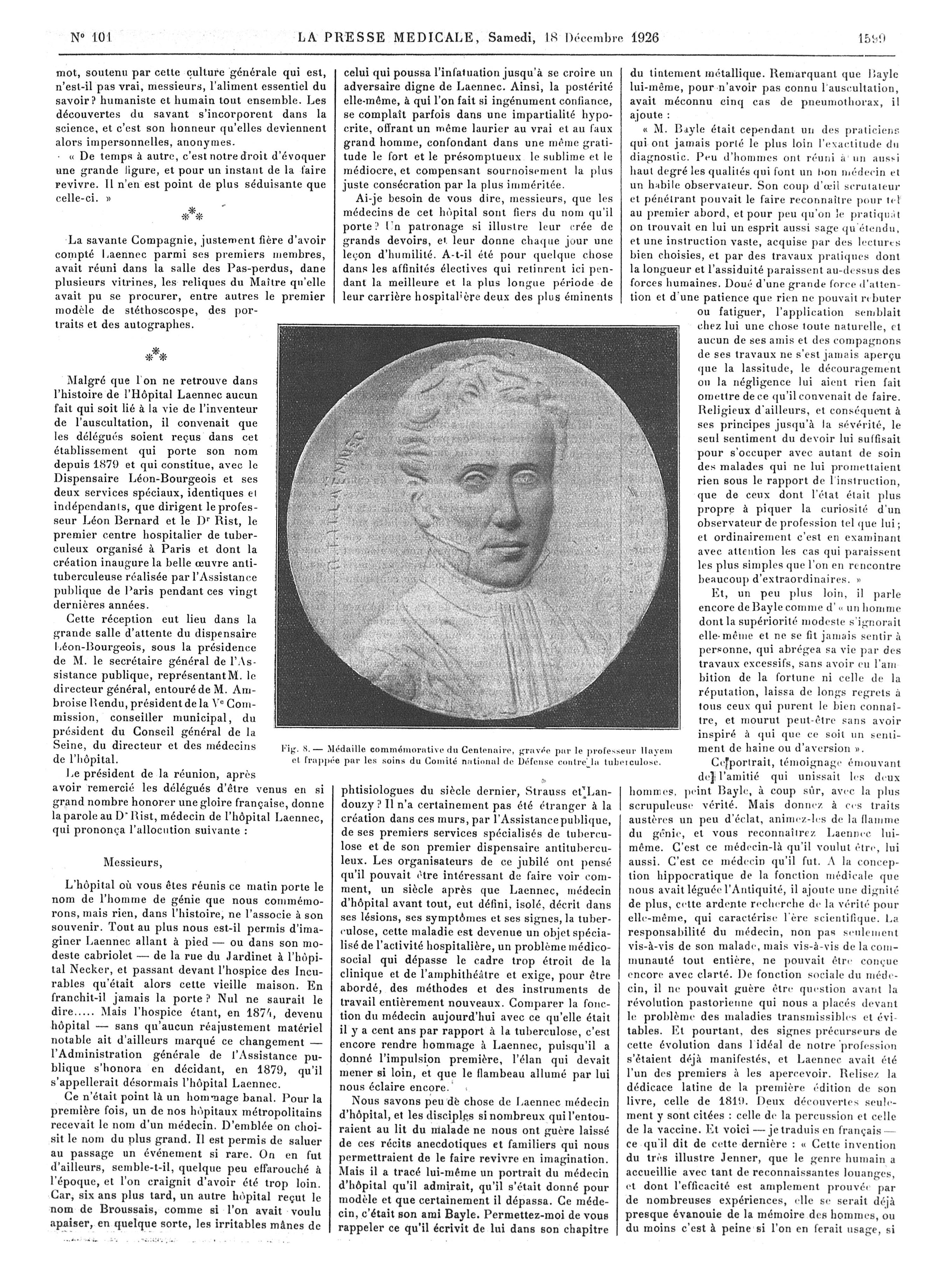 Fig. 8. Médaille commémorative du Centenaire [de Laennec], gravée par le Professeur Hayem et frappée par les soins du comité national de défense contre le tuberculose - La Presse médicale - [Articles originaux]