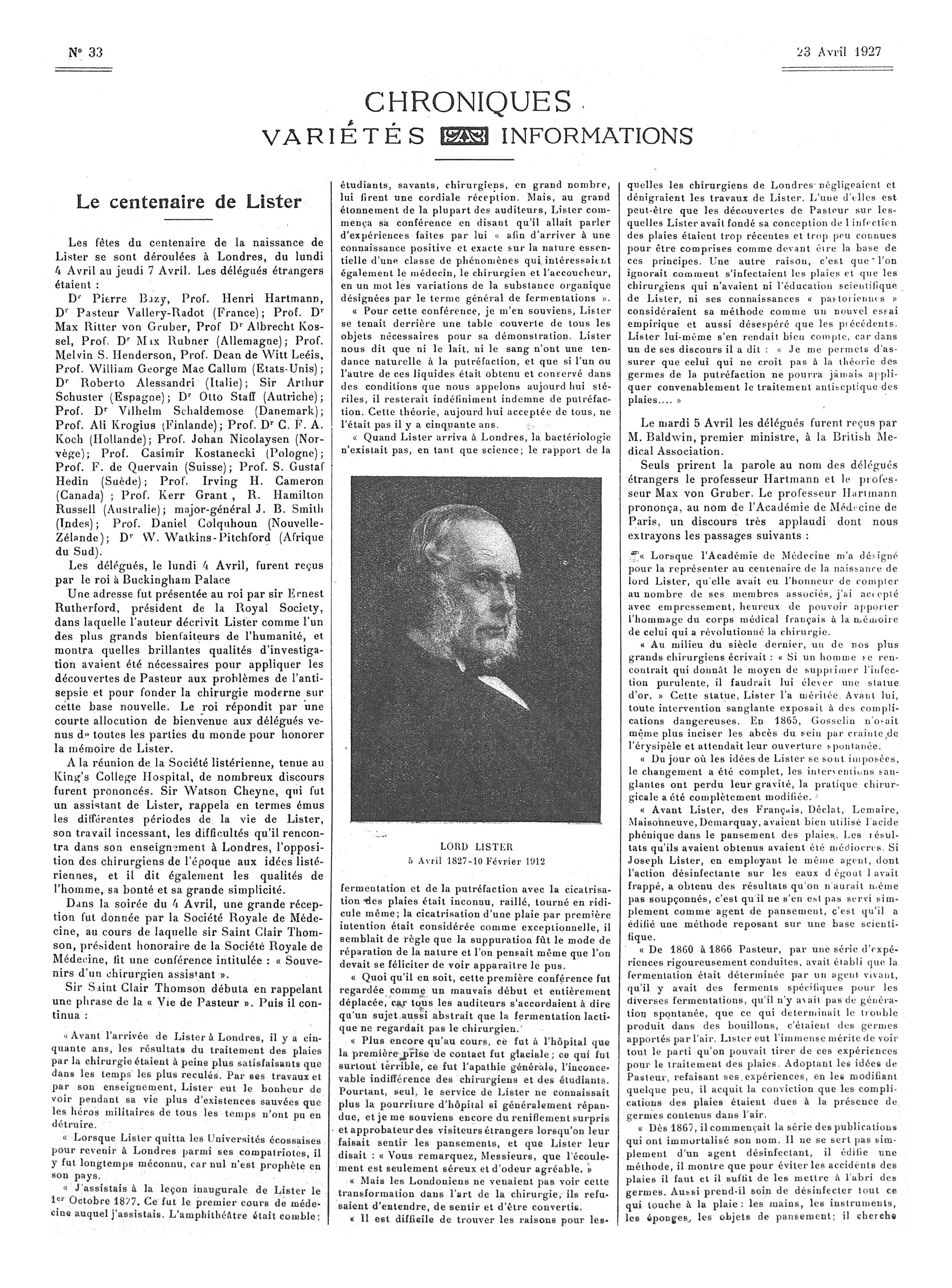 Lord Lister. 5 avril 1827-10 février 1912 - La Presse médicale - [Articles originaux]