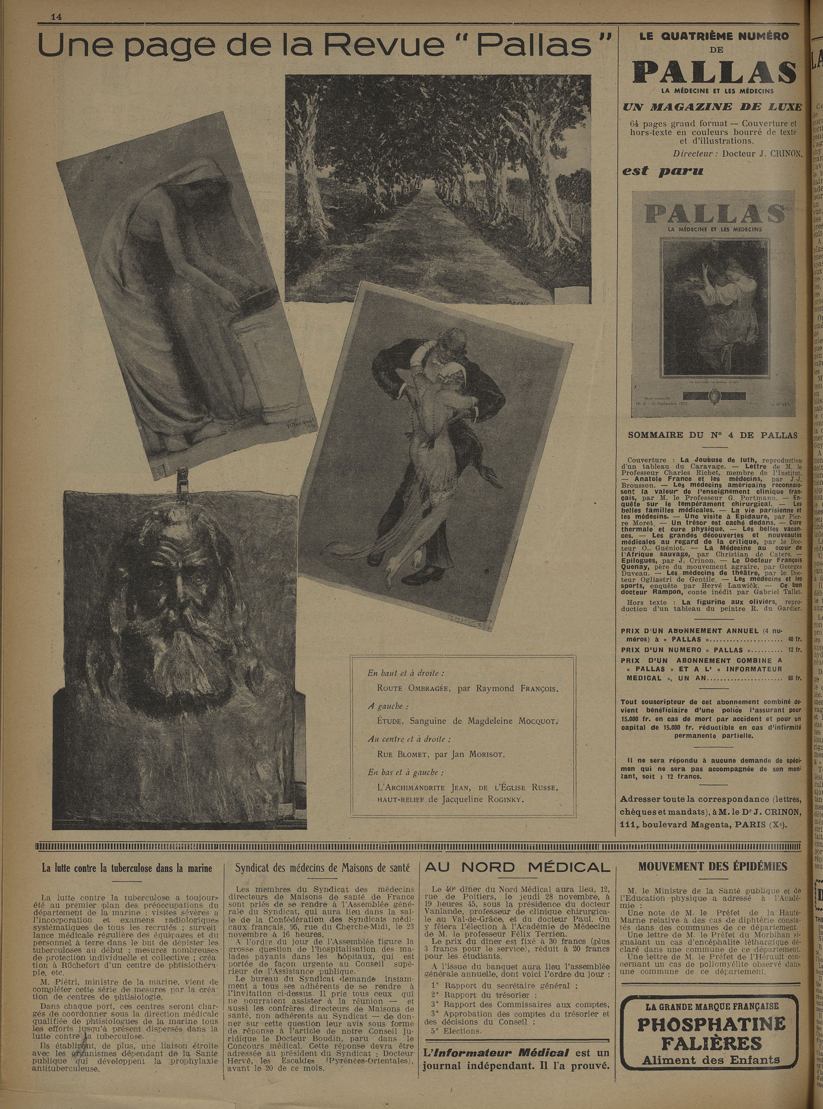 En haut et à droite : route ombragée, par Raymond François. A gauche : Etude, sanguine de Magdeleine Mocquot. Au centre et à droite : rue Blomet, par Jan Morisot. En bas et à gauche : L'Archimandrite Jean, de l'église russe, haut-relief de Jacqueline Roginky - L'informateur médical