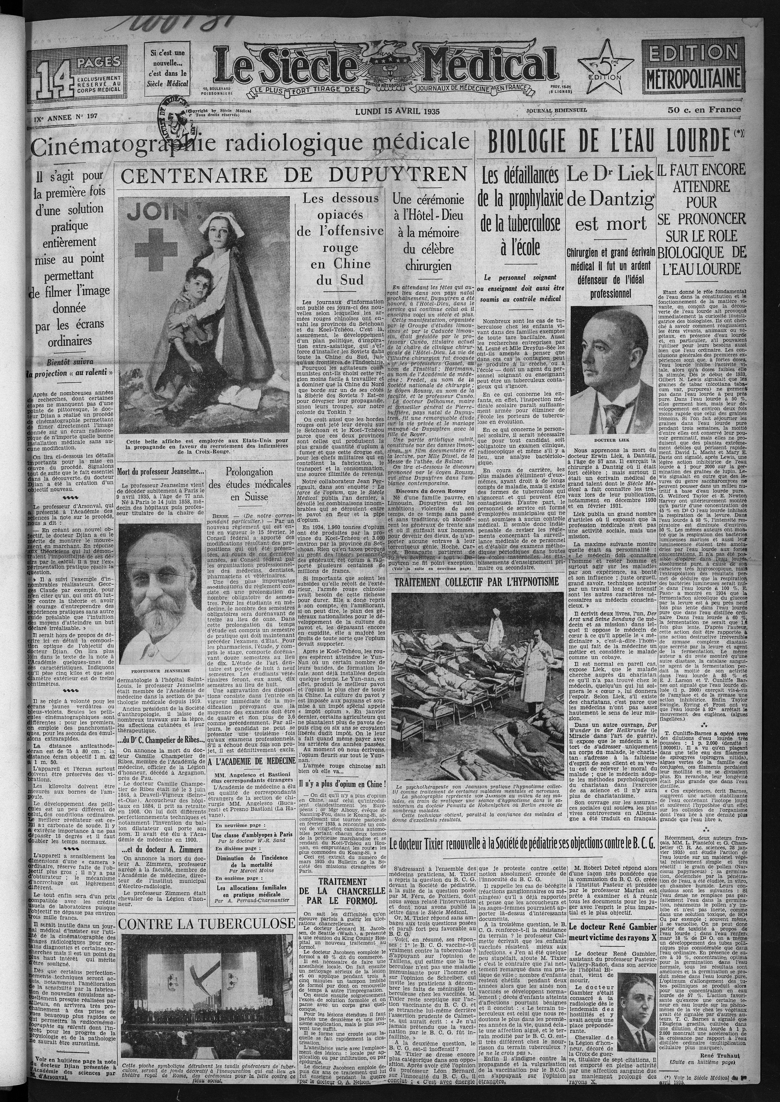 Cette belle affiche est employée aux Etats-Unis pour la propagande en faveur du recrutement des infirmières de la Croix-Rouge / Professeur Jeanselme / Cette pioche symbolique détruisant les taudis générateurs de tuberculose, servait de fonds décoratif à l'inauguration qui eut lieu au théâtre royal de Rome, des cérémonies pour la lutte contre ce fléau social / Le psychothérapeute von Jaansson pratique l'hypnotisme collectif comme traitement de certaines maladies mentales et nerveuses. La photographie représente von Jaansson au milieu de ses malades, en train de pratiquer une séance d'hypnotisme dans le sanatorium du Docteur Panwitz de Hohenlychen où Berlin envoie de nombreux malades. Cette technique obtient, paraît-il la confiance des malades et donne d'excellents résultats / Docteur Liek / Docteur René Gambier - Le siècle médical