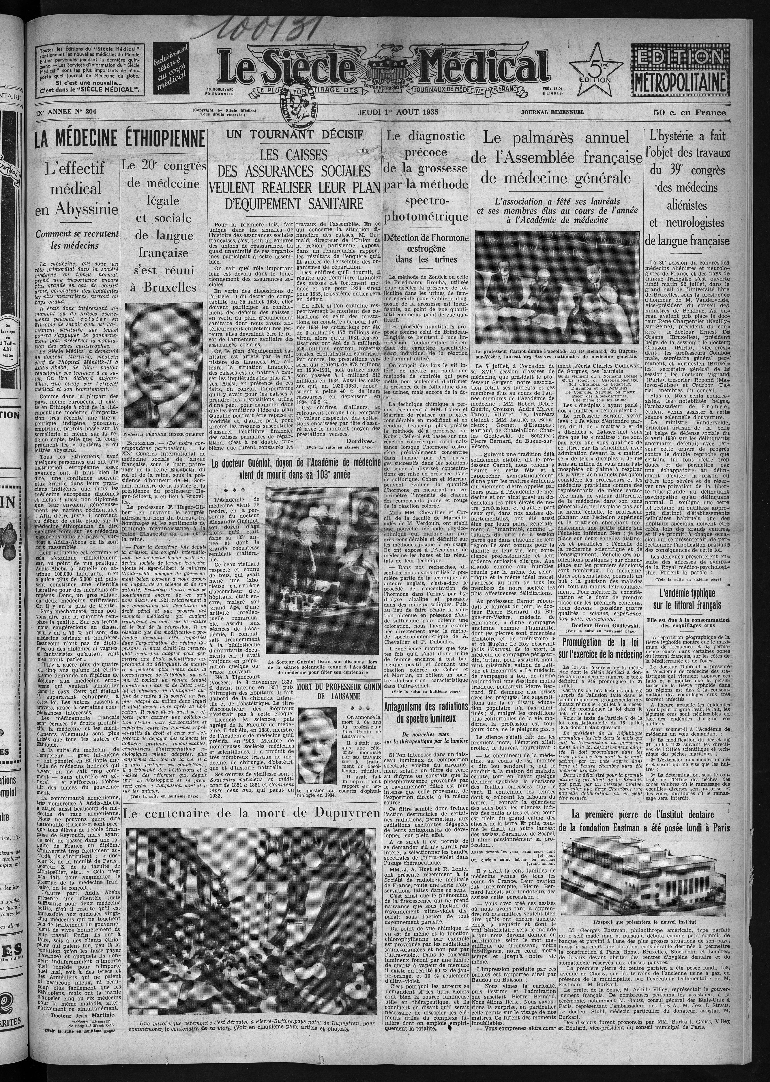 Professeur Fernand Heger-Gilbert / Le Docteur Guéniot lisant son discours lors de la séance solennelle tenue à l'Académie de médecine pour fêter son centenaire / Professeur Jules Gonin / Une pittoresque cérémonie s'est déroulée à Pierre-Bufière pays natal de Dupuytren, pour commémorer le centenaire de sa mort / Le Professeur Carnot donne l'accolade au Dr Bernard, du Bugues-sur-Vézère, lauréat des Assises nationales de médecine générale / L'aspect que présentera le nouvel institut - Le siècle médical