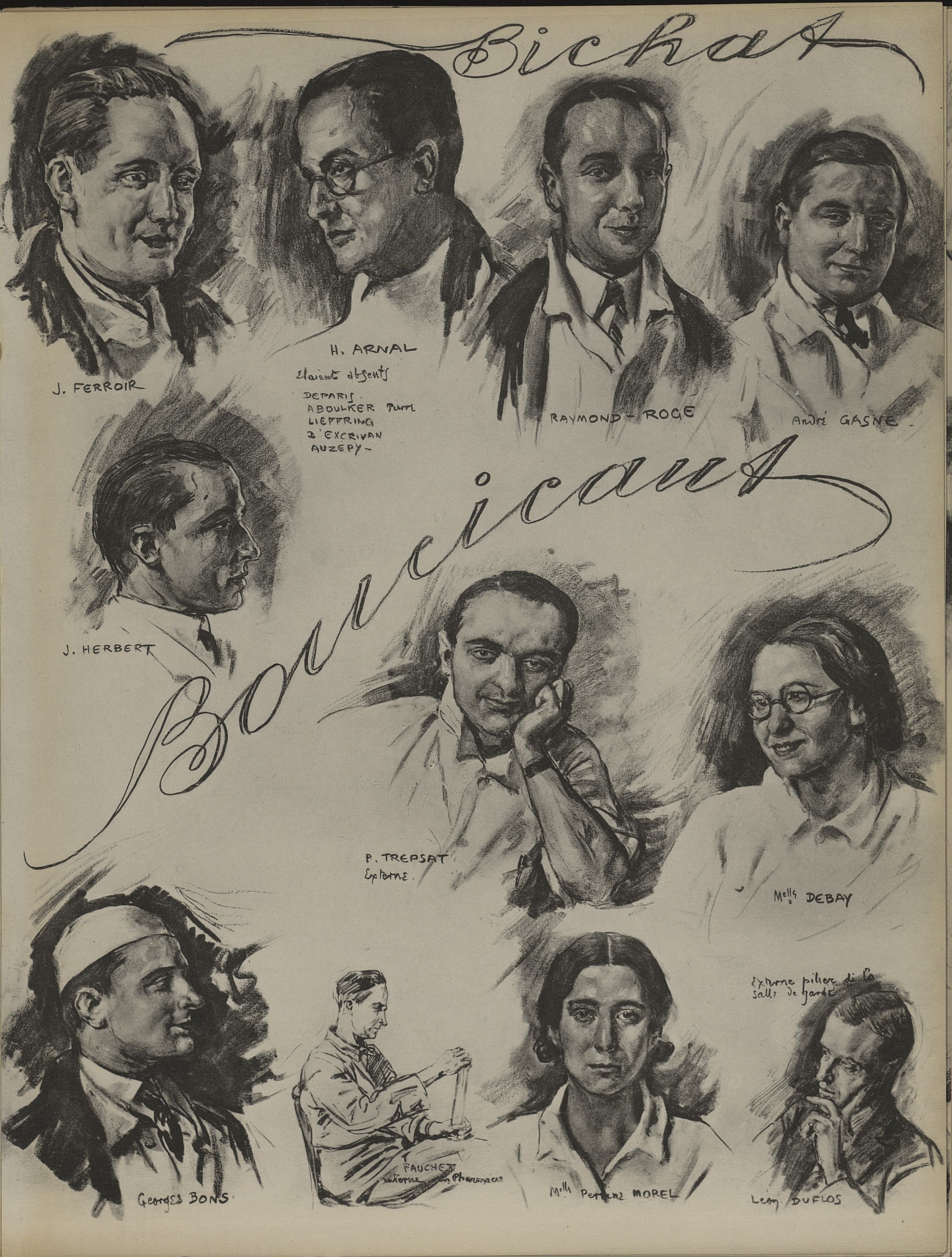 Bichat: J. Ferroir ; H. Arnal ; Raymond Roge ; André Gasne ; J. Herbert / Boucicaut: P. Trepsat ; Mlle Debay ; Georges Bons ; Fauchet ; Melle Perrine Morel ; Léon Duflos - Album de l'internat