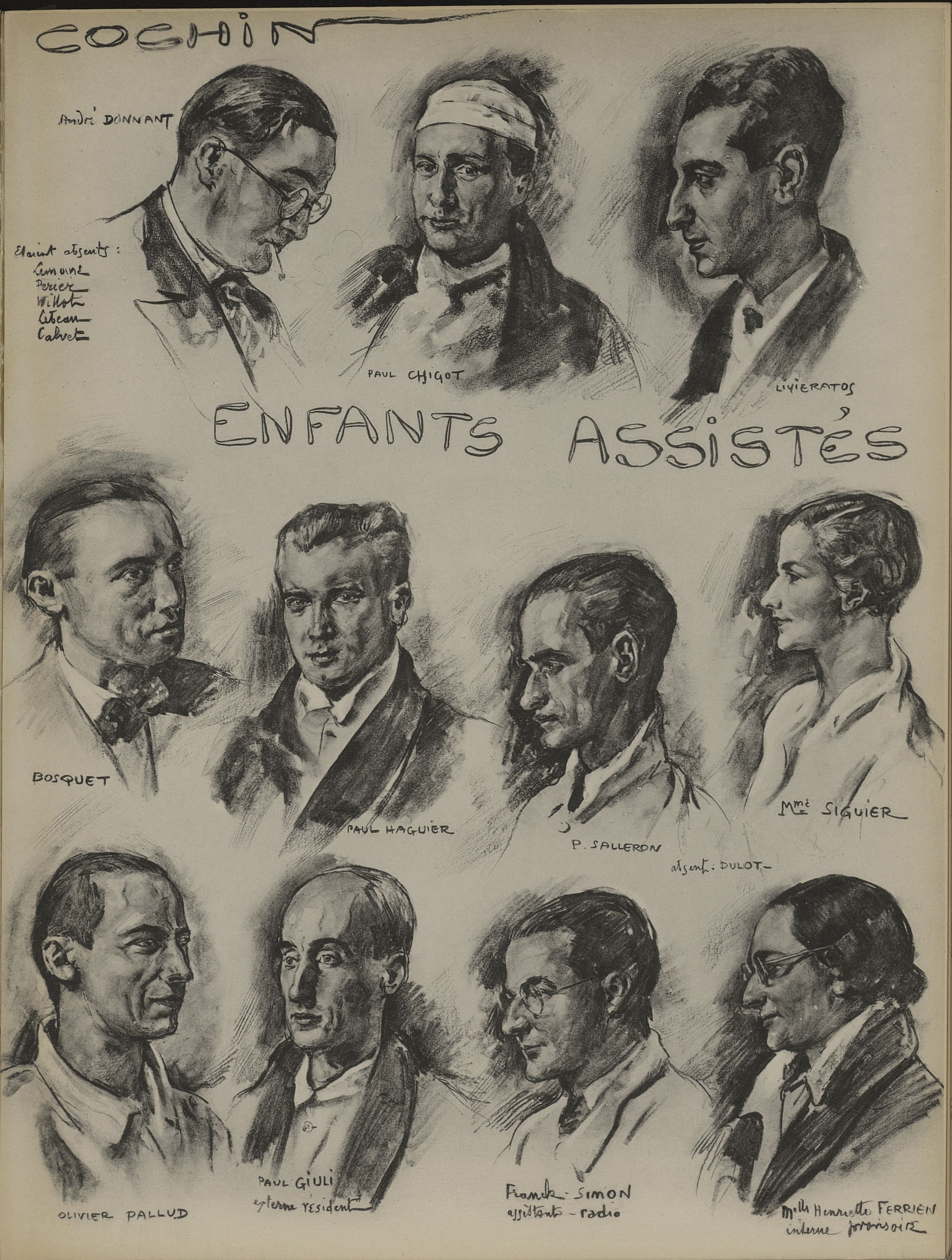 Cochin: André Donnant ; Paul Chigot ; Livieratos / Enfants assistés: Bosquet ; Paul Haguier ; P. Salleron ; Mme Siguier ; Olivier Pallud ; Paul Giuli ; Franck Simon ; Melle Henriette Ferrien - Album de l'internat