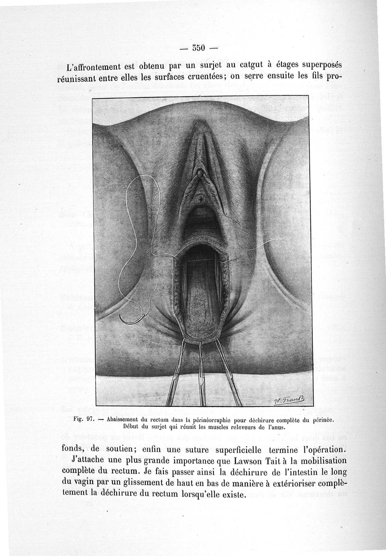 Fig. 97. Abaissement du rectum dans la périnéorraphie pour déchirure complète du périnée - Notice sur les travaux scientifiques