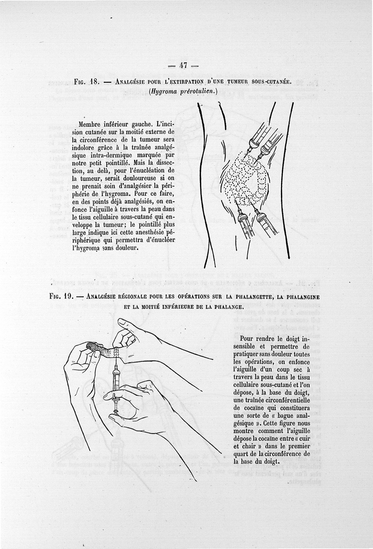 Fig. 18. Analgésie pour l'extirpation d'une tumeur sous-cutanée (Hygroma prérotulien.) / Fig. 19. Analgésie régionale pour les opérations sur la phalangette, la phalangine et la moitié inférieure de la phalange - Exposé des titres et des travaux scientifiques du Pr Paul Reclus