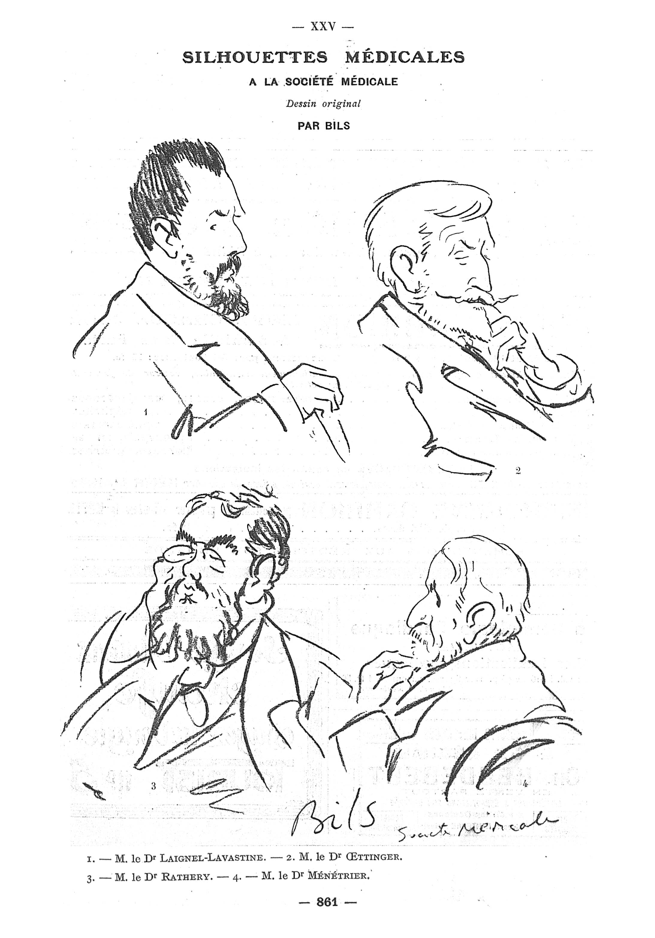 [Caricatures par Bils : ] 1. - M. le Dr Laignel-Lavastine. - 2. - M. le Dr Oettinger. - 3. - M. le Dr Rathery. - 4. - M. le Dr Ménétrier - Paris médical : la semaine du clinicien