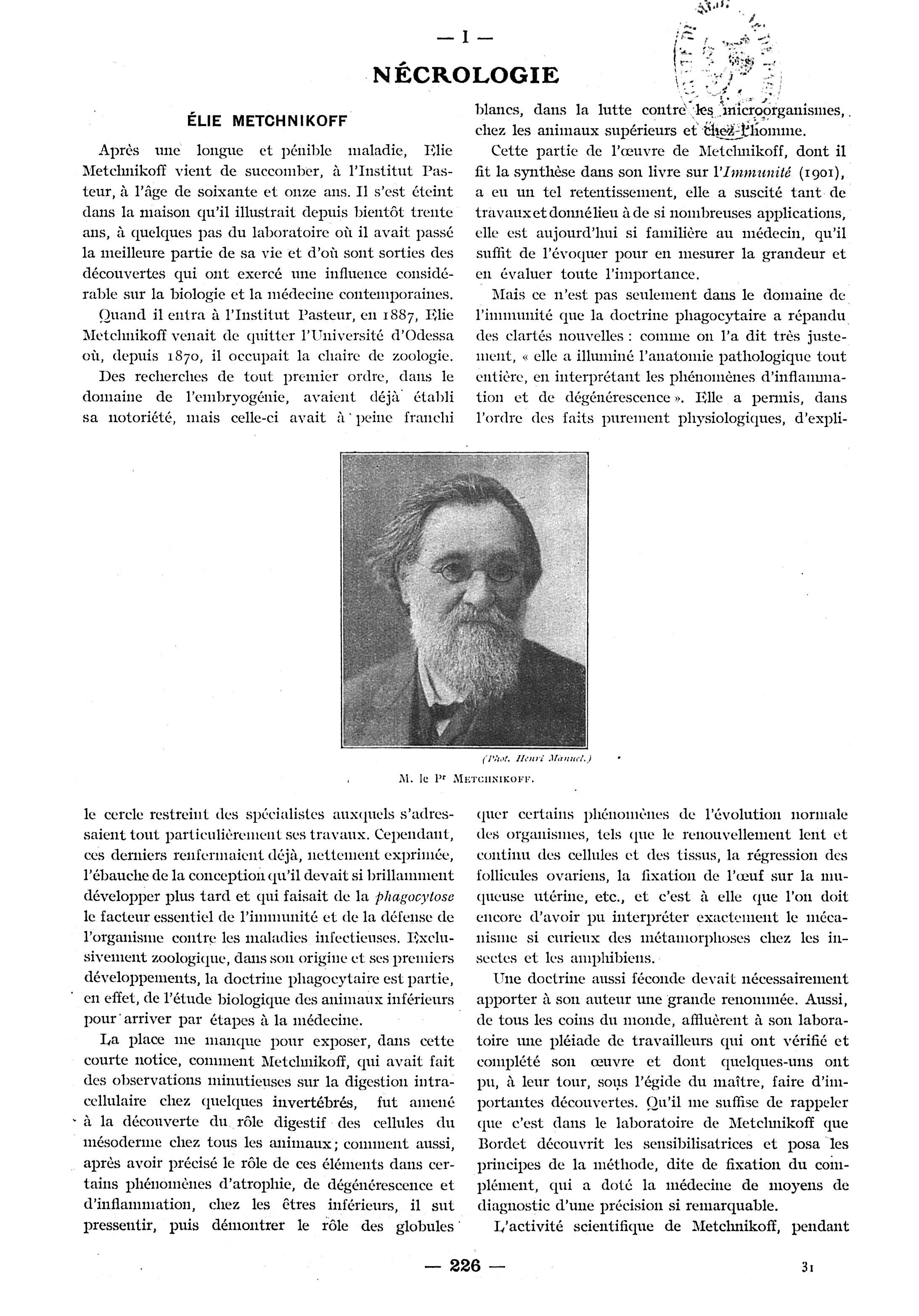 M. le Pr Metchnikoff - Paris médical : la semaine du clinicien