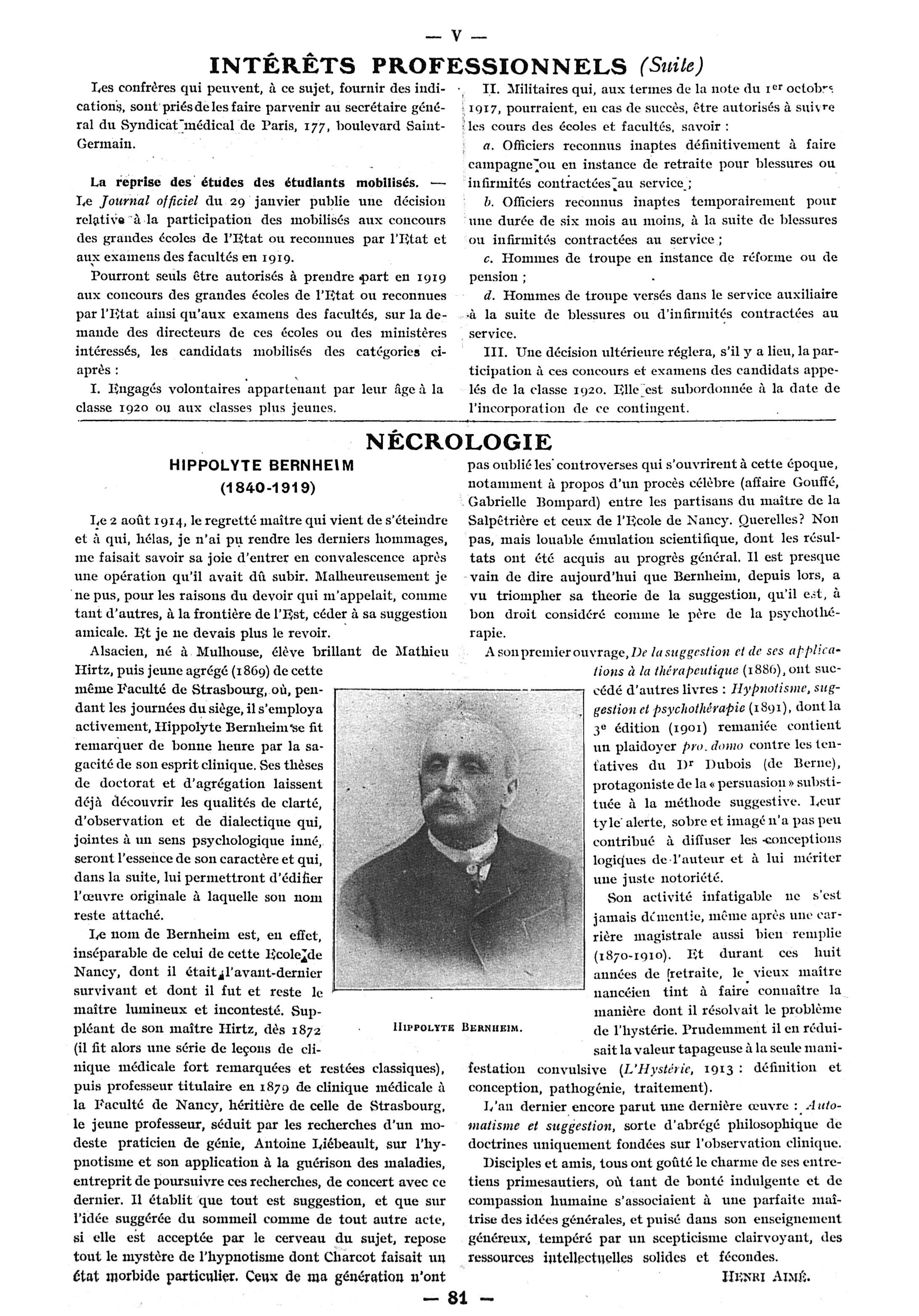 Hippolyte Bernheim - Paris médical : la semaine du clinicien