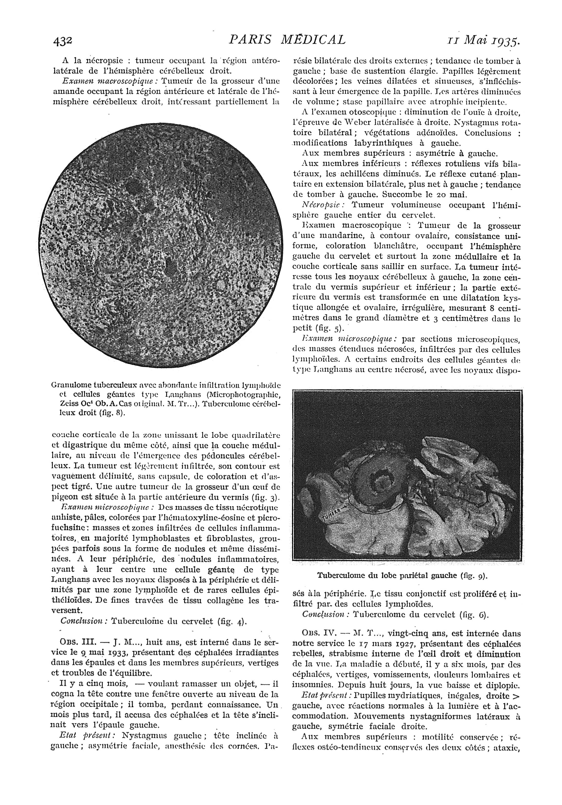Fig. 8. - Granulome tuberculeux avec abondante infiltration lymphoïde et cellules géantes type Langhans / Fig. 9. - Tuberculome du lobe pariétal gauche - Paris médical : la semaine du clinicien
