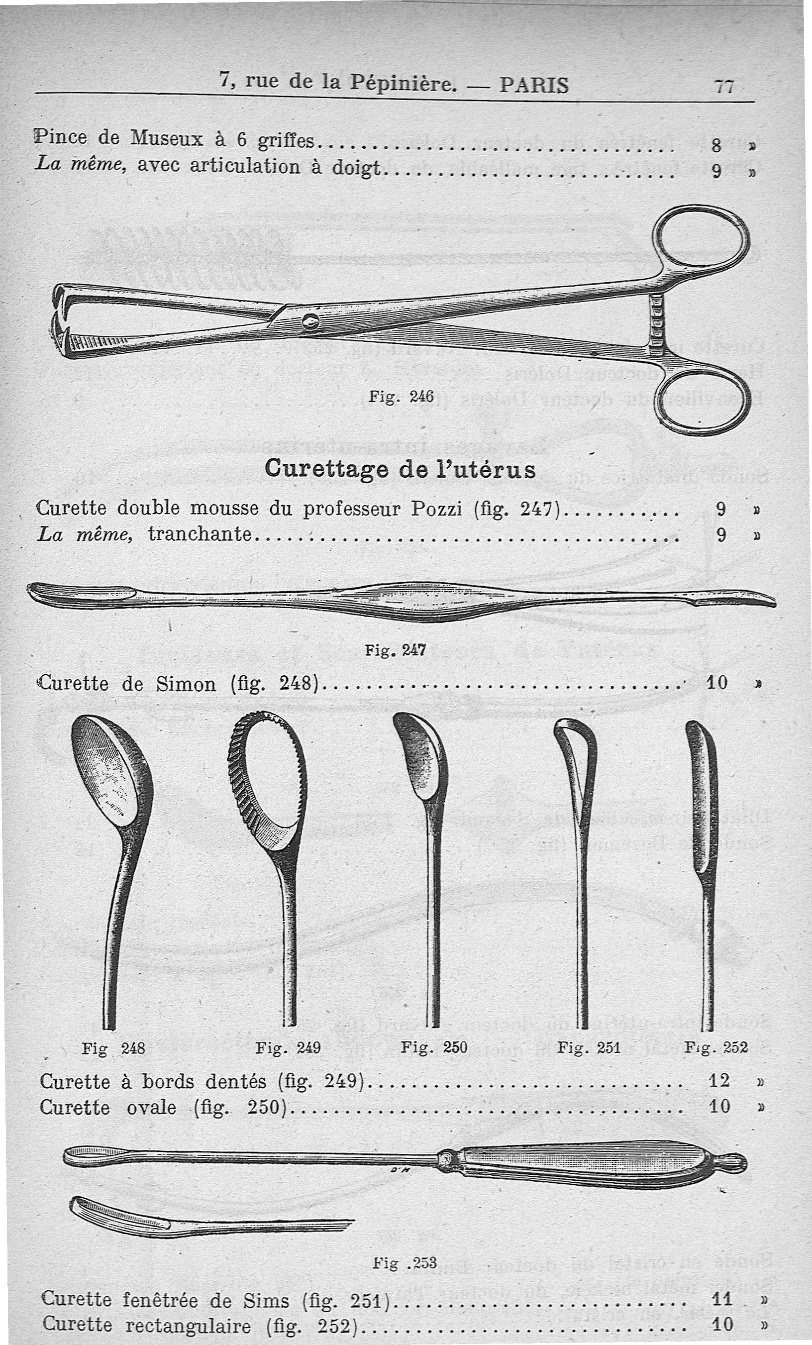 Pince à quatre griffes de Museux. Curettage de l'utérus. Curette double mousse du professeur Pozzi - Instruments et appareils de l' art médical P. Natton succ. A. Poisson