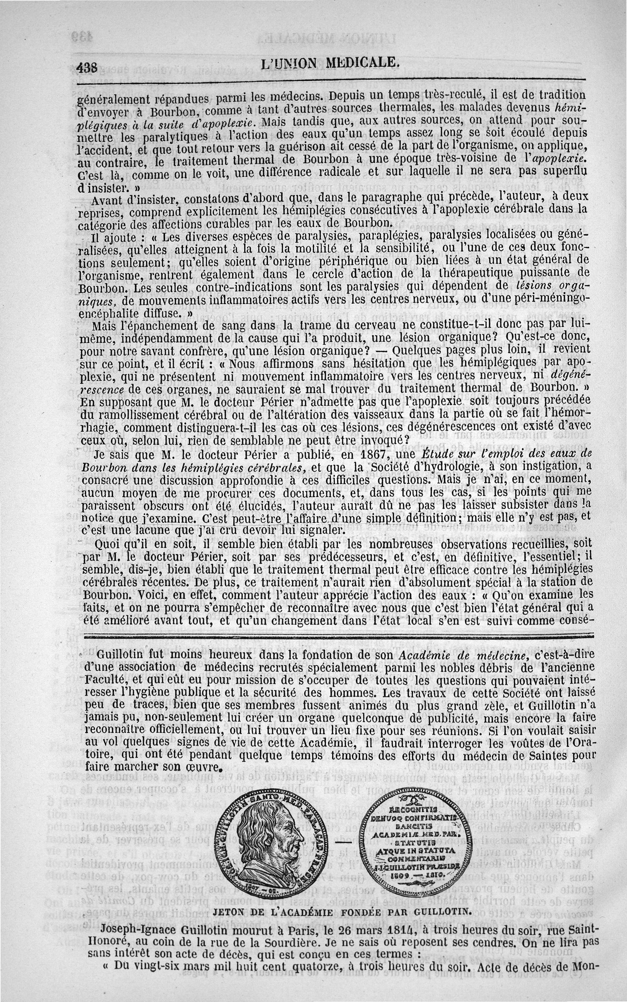 Jeton de l'Académie fondée par Guillotin - L'Union médicale : journal des intérêts scientifiques et pratiques, moraux et professionnels du corps médical