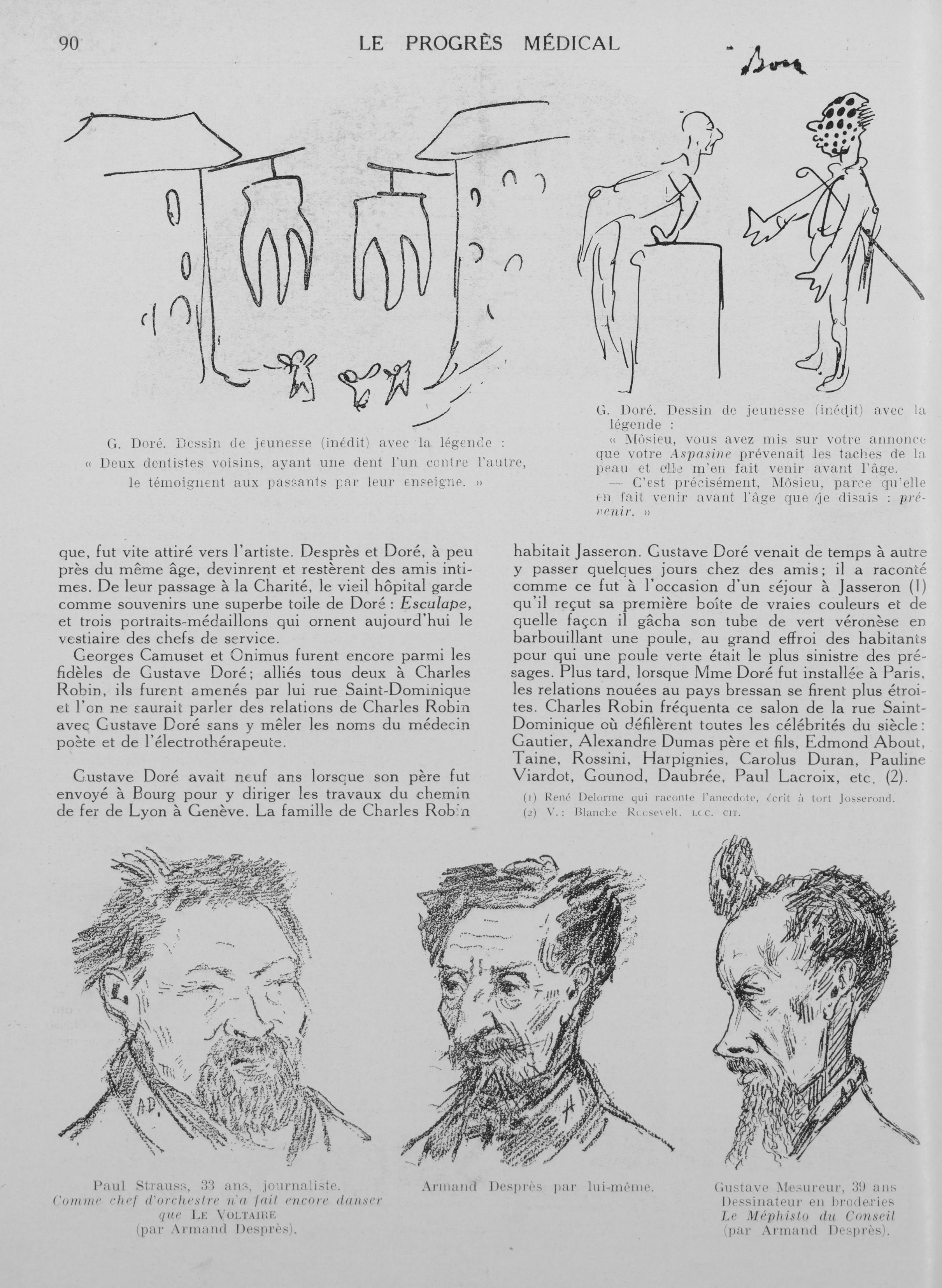 G. Doré. Dessin de jeunesse (inédit) avec la légende: «Deux dentistes voisins, ayant une dent l'un contre l'autre, le témoignent aux passants par leur enseigne.» / G. Doré. Dessin de jeunesse (inédit) avec la légende: «Môsieu, vous avez mis sur votre annonce que votre Aspasine prévenait les taches de la peau et elle m'en fait venir avant l'âge. - C'est précisément, Môsieu, parce qu'elle en fait venir avant l'âge que je disais prévenir.» / Paul Strauss, 33 ans, journaliste. Comme Chef d'orchestre n'a fait encore danser que Le Voltaire (par Armand Desprès) / Armand Desprès par lui-même / Gustave Mesureur, 39 ans. Dessinateur en broderies Le Méphisto du Conseil (par Armand Desprès) - Le progrès médical
