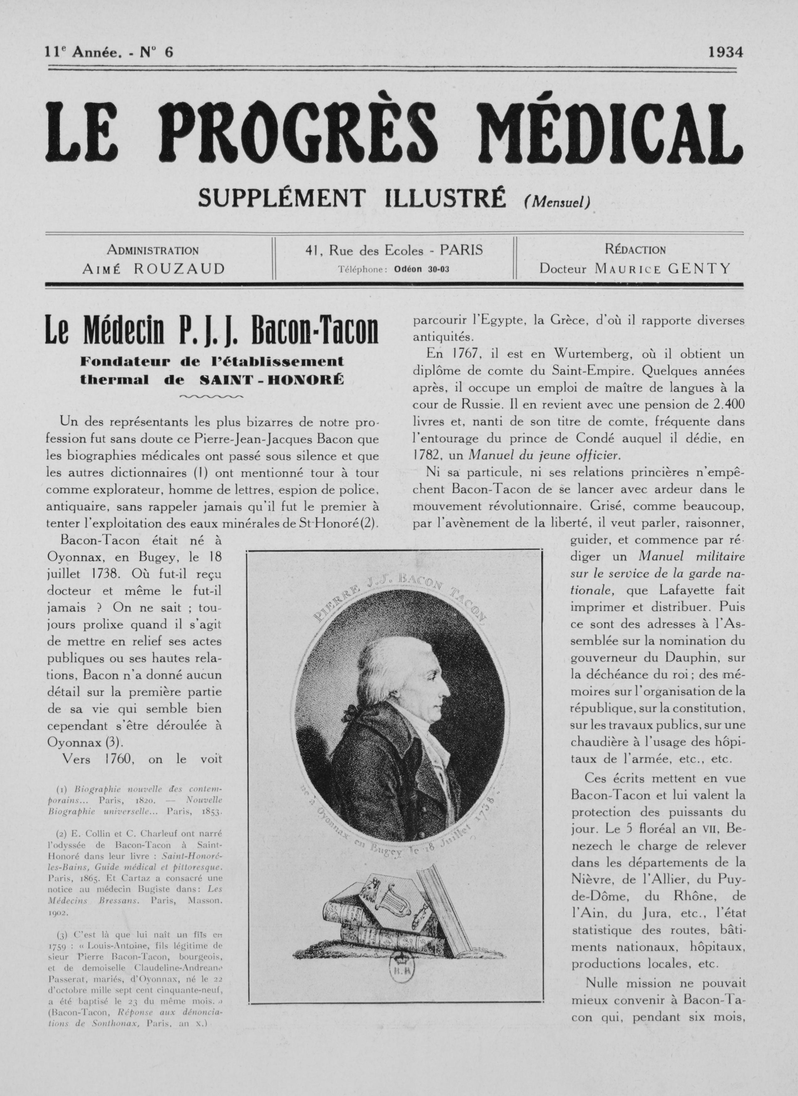 Pierre J.J. Bacon Tacon, né à Oyonnax en Bugey le 18 juillet 1738 - Le progrès médical