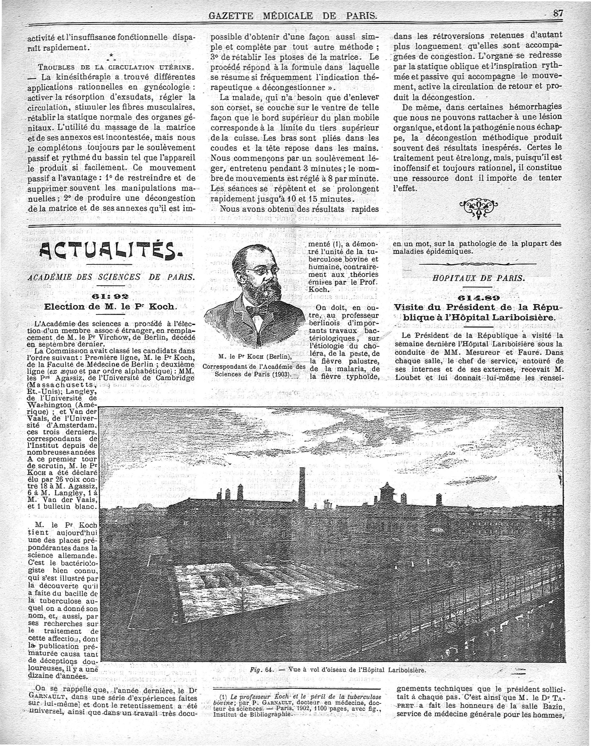 M. le Pr Koch (Berlin) / Fig. 64. Vue à vol d'oiseau de l'Hôpital Lariboisière - Gazette médicale de Paris : journal de médecine et des sciences accessoires