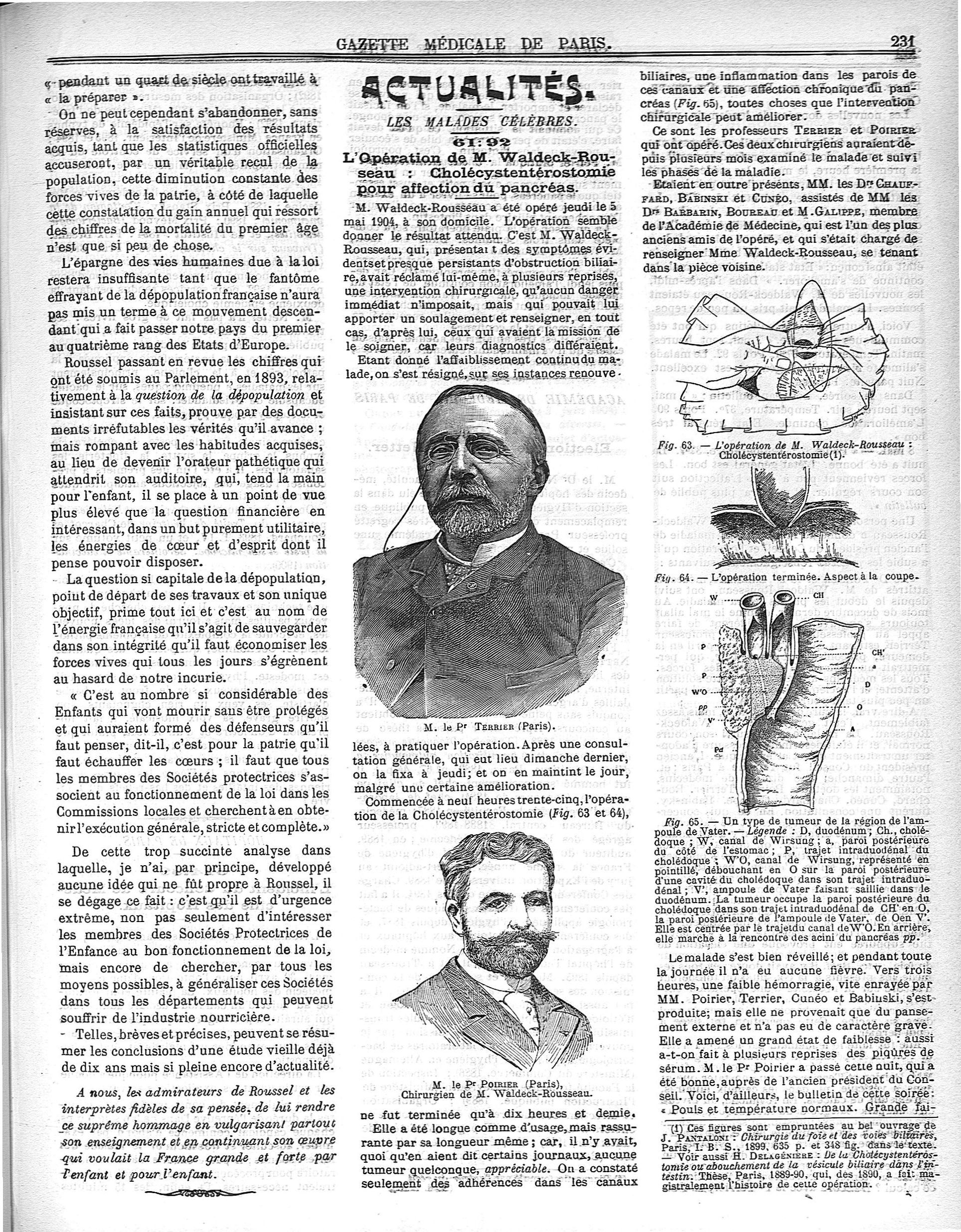 M. le Pr Terrier / M. le Pr Poirier / Fig. 63. L'opération de M. Waldeck-Rousseau : cholécystentérostomie / Fig. 64. L'opération terminée. Aspect à la coupe / Fig. 65. Un type de tumeur de la région de l'ampoule de Vater - Gazette médicale de Paris : journal de médecine et des sciences accessoires
