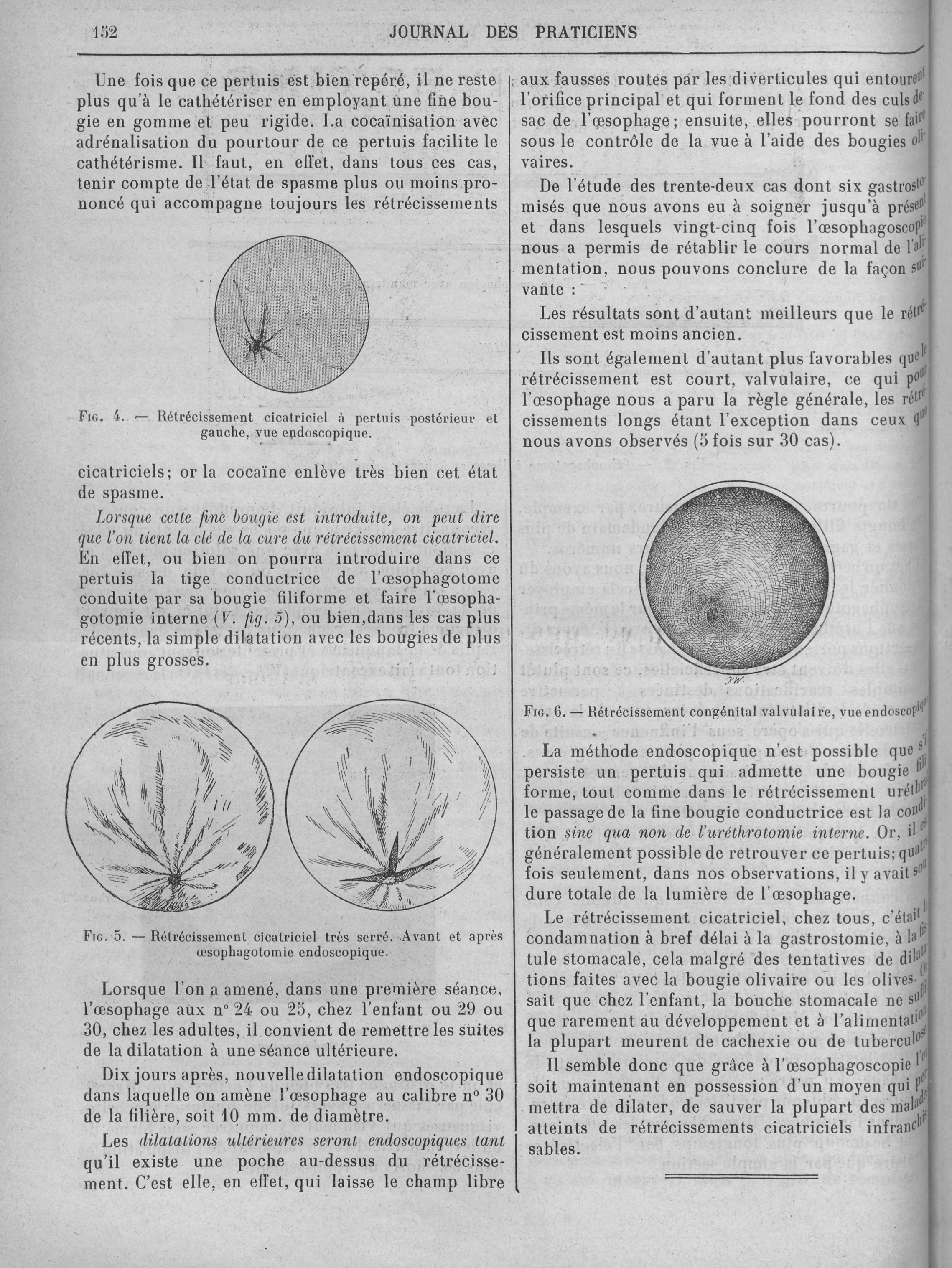 Fig. 4. Rétrécissement cicatriciel à pertuis postérieur et gauche, vue endoscopique / Fig. 5. Rétrécissement cicatriciel très serré. Avant et après oesophagotomie endoscopique / Fig. 6. Rétrécissement congénital valvulaire, vue endoscopique - Revue générale de clinique et de thérapeutique - Journal des praticiens