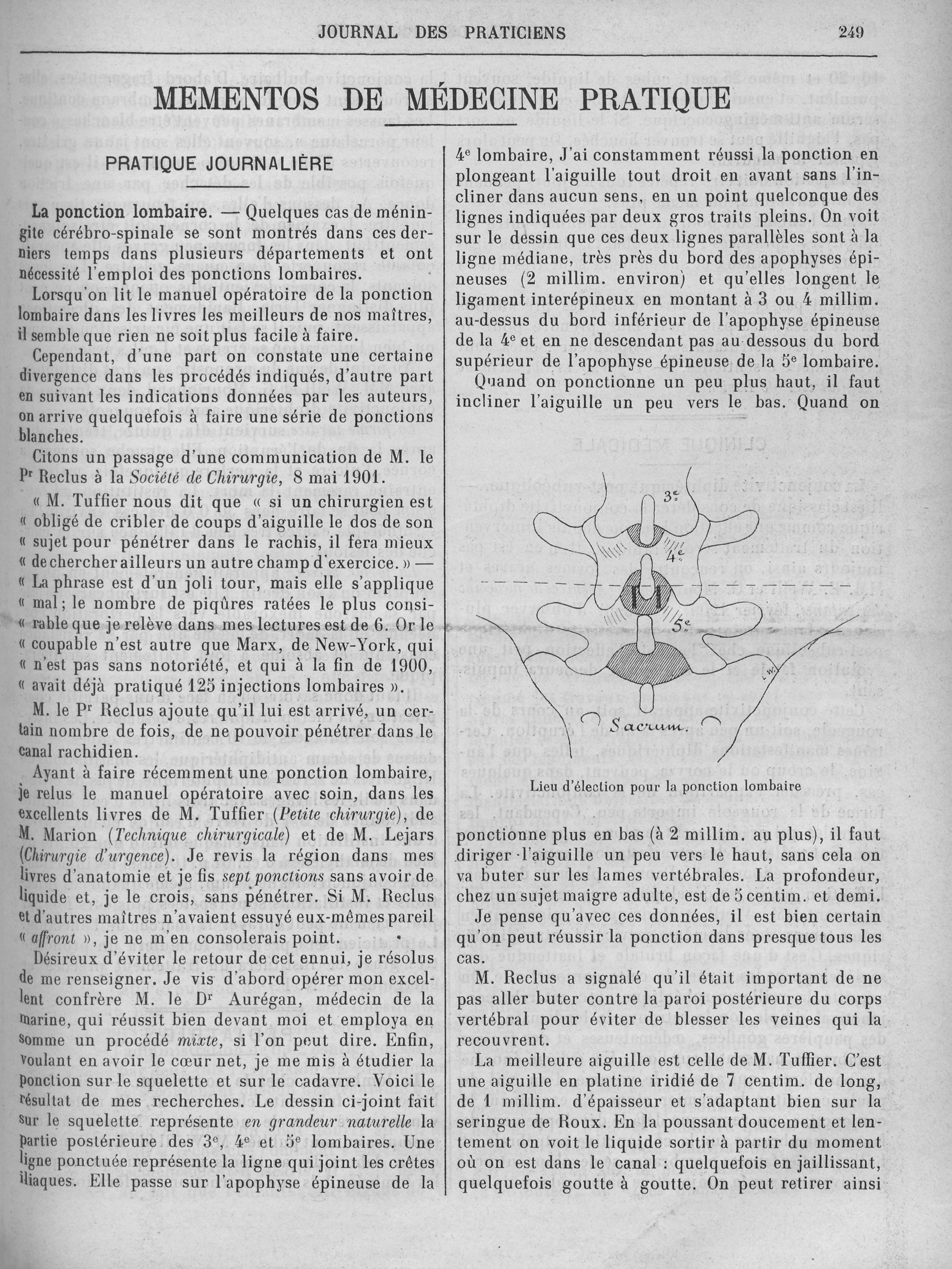 Lieu d'élection pour la ponction lombaire - Revue générale de clinique et de thérapeutique - Journal des praticiens