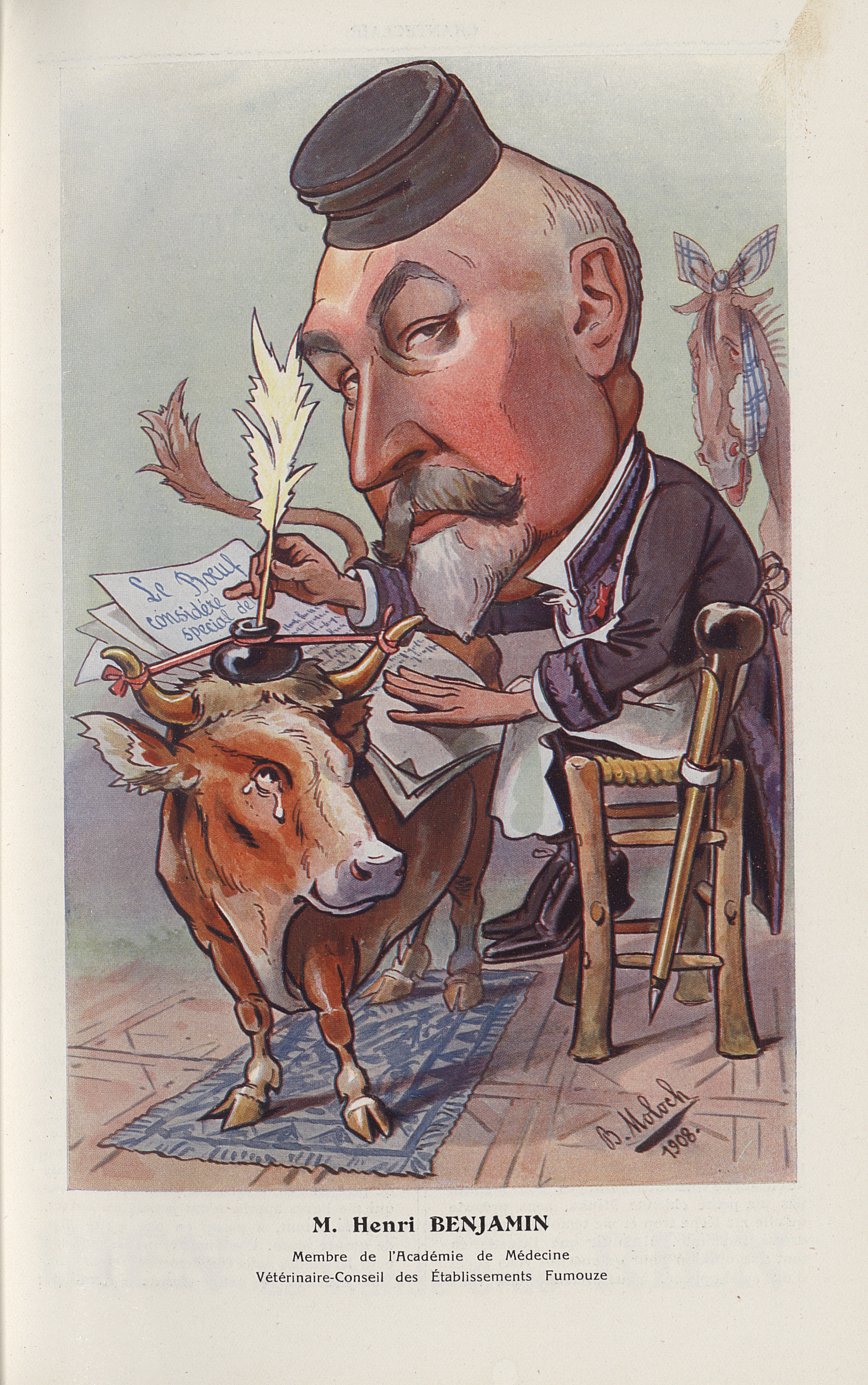 [Caricature] M. Henri Benjamin. Membre de l'Académie de médecine. Vétérinaire-conseil des établissements Fumouze (B. Moloch) - Chanteclair