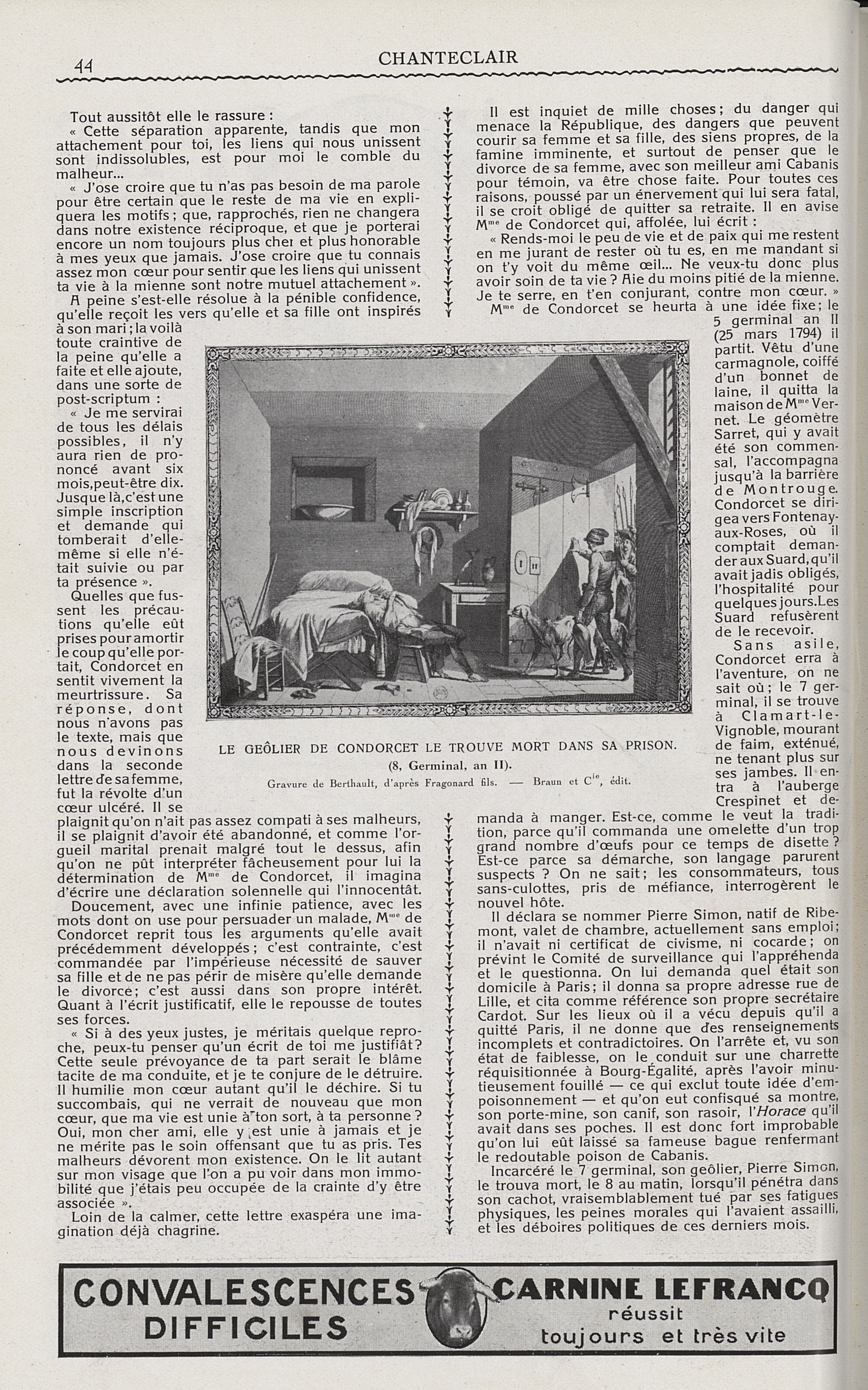 Le géôlier de Condorcet le trouve mort dans sa prison (Berthault) - Chanteclair