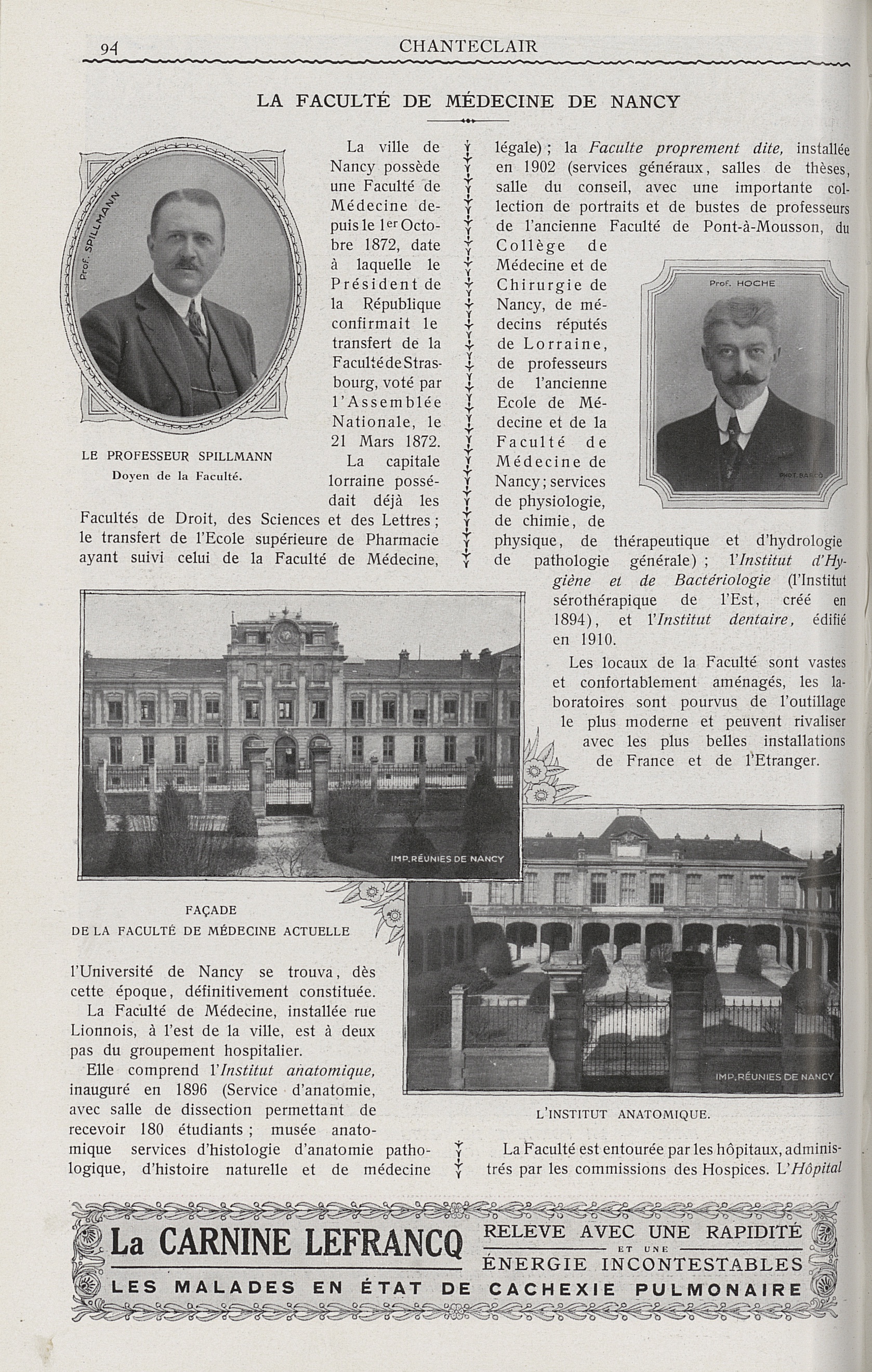 Le Professeur Spillman. Doyen de la Faculté / Prof. Hoche / Façade de la Faculté de médecine actuelle / L'Institut anatomique - Chanteclair