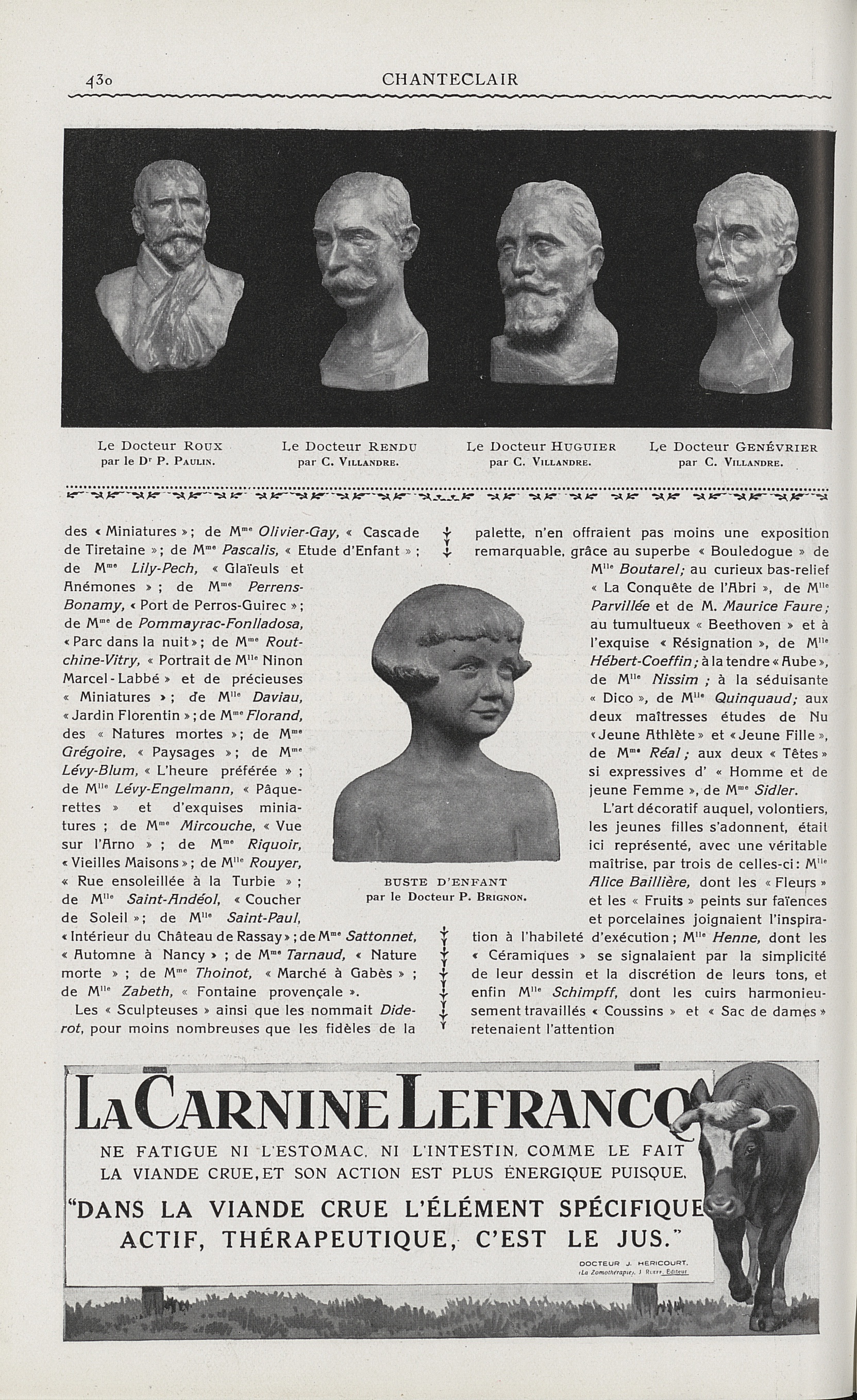 Le Docteur Roux, par le Dr P. Paulin / Le Docteur Rendu, par C. Villandre / Le Docteur Huguier, par C. Villandre / Le Docteur Genévrier, par C. Villandre / Buste d'enfant, par le Docteur P. Brignon - Chanteclair