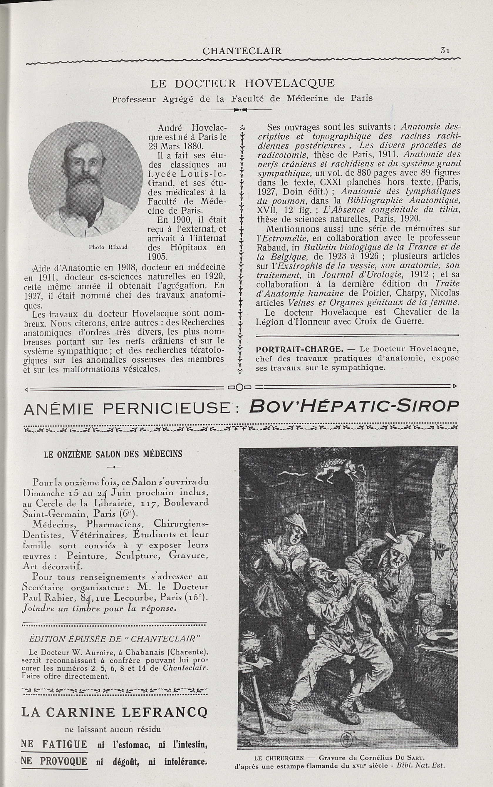Le Docteur Hovelacque. Professeur agrégé de la Faculté de médecine de Paris / Le chirurgien (Cornélius du Sart) - Chanteclair