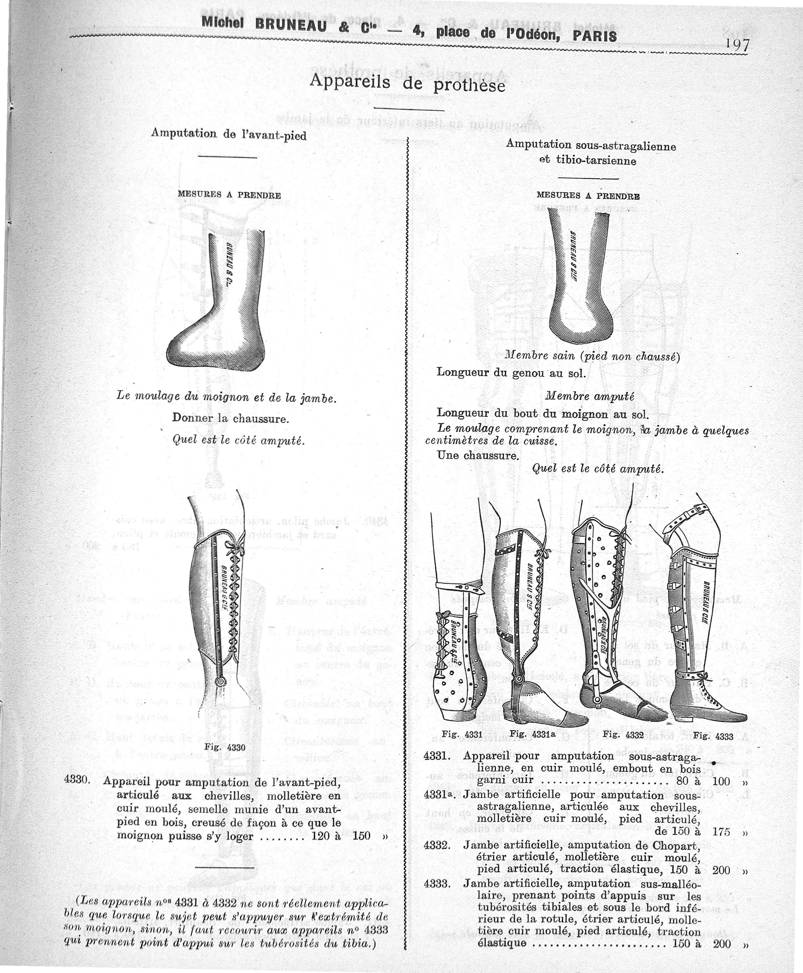 Amputation de l'avant-pied. Mesures à prendre. Appareil pour amputation de l'avant-pied, articulé aux chevilles, molletière en cuir moulé, semelle munie d'un avant pied en bois, creusé de façon à ce que le moignon puisse s'y loger. Amputation sous-astragalienne et tibio-tarsienne. Mesures à prendre. Appareil pour amputation sous astragalienne, en cuir moulé, embout en bois garni cuir. Jambe artificielle pour amputation sous-astragalienne, articulée aux chevilles, molletière cuir moulé, pied articulé. Jambe artificielle, amputation de Chopart, étrier articulé, molletière cuir moulé, pied articulé, traction élastique. Jambe artificielle, amputation sus-malléolaire, prenant points d'appui sur les tubérosités tibiales et sous le bord inférieur de la rotule, étrier articulé, molletière cuir moulé, pied articulé, traction élastique - Catalogue illustré d'instruments de chirurgie
