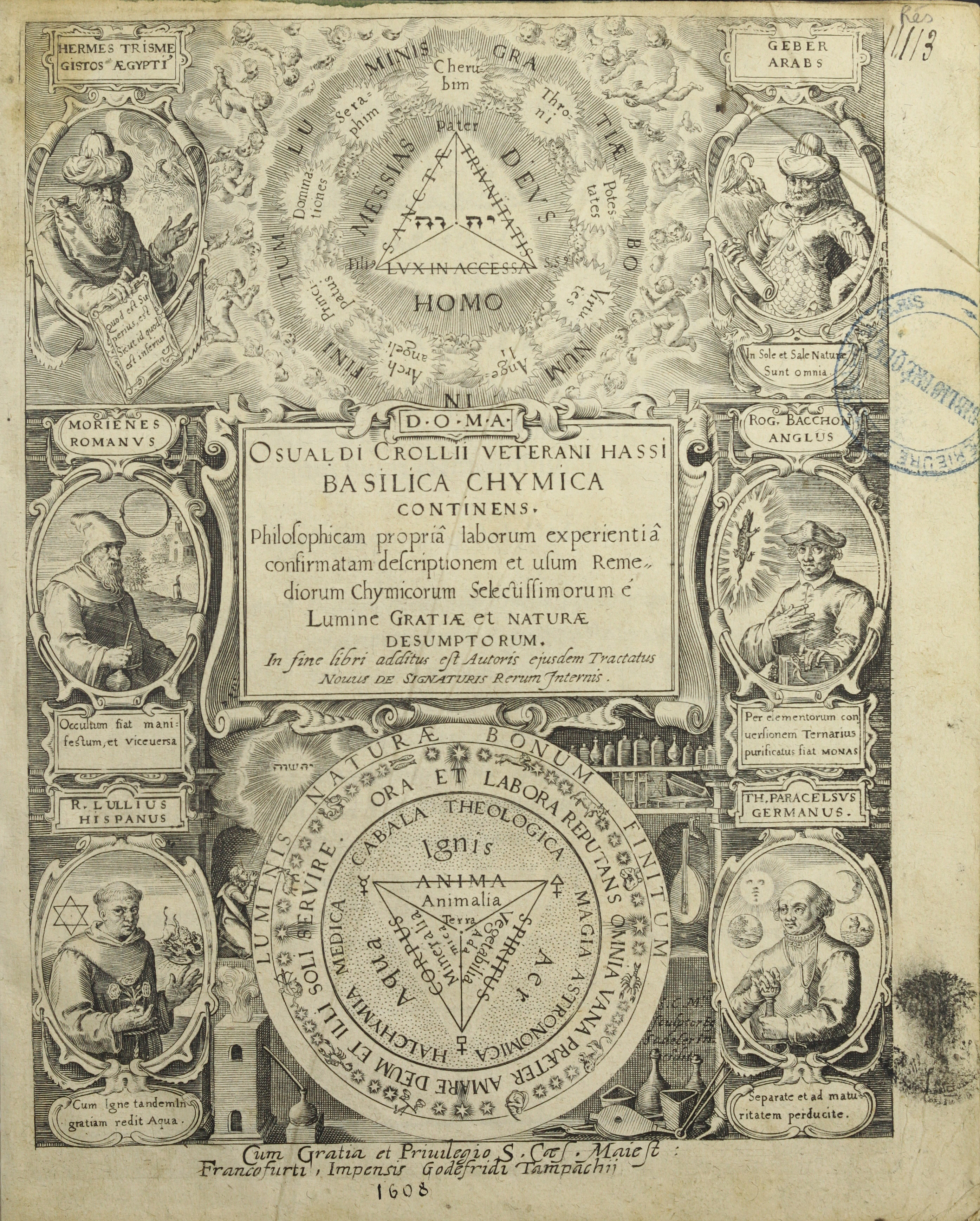 [Frontispice : Osvaldi Crollii … Basilica Chymica] - Osvaldi Crollii Basilica chymica continens philosophicam propria laborum experientia confirmatam descriptionem et usum remediorum chymicorum selectissimorum e lumine gratiae et naturae desumptorum. In fine additus est autoris ejusdem Tractatus novus De signaturis rerum internis.