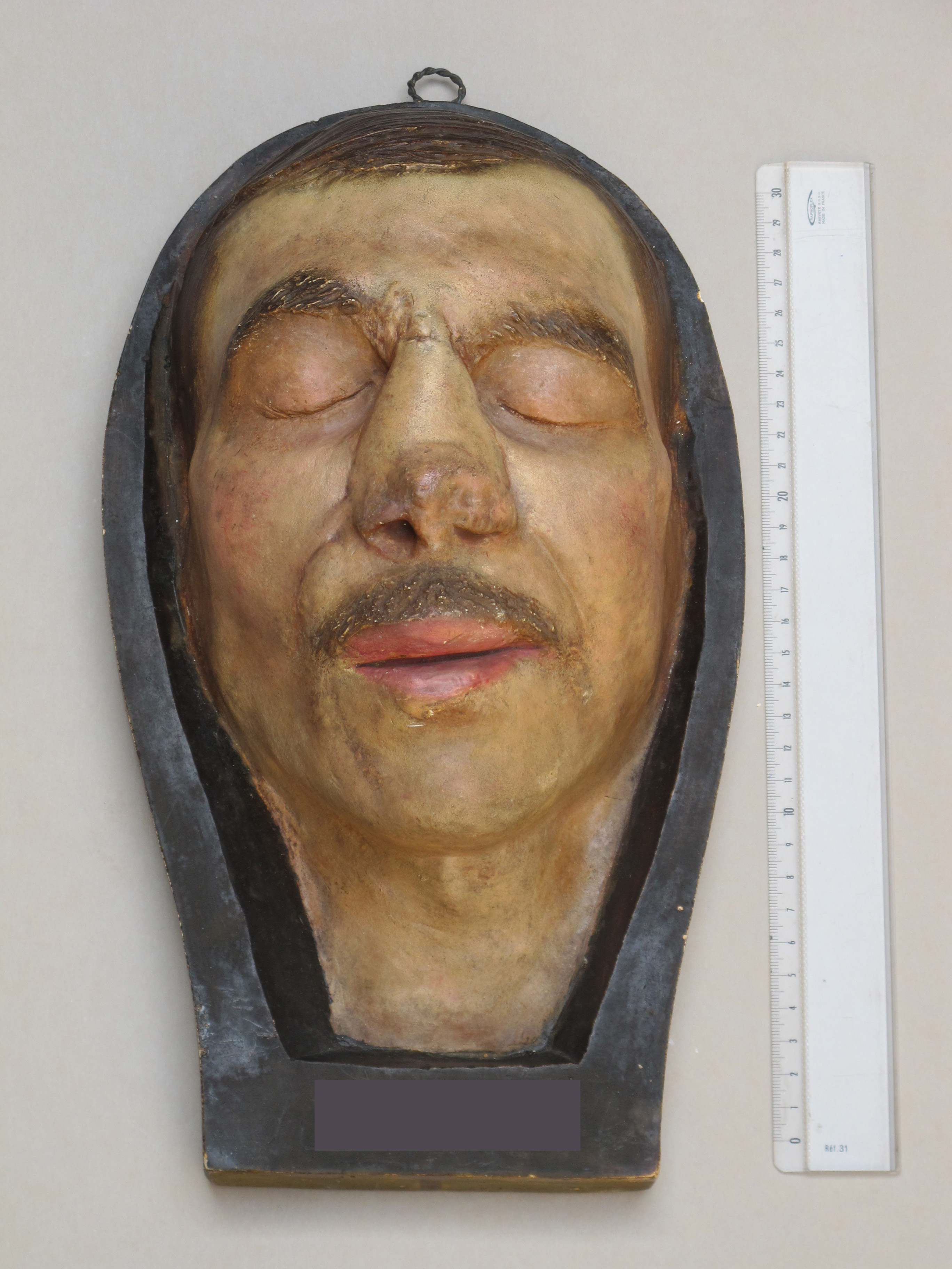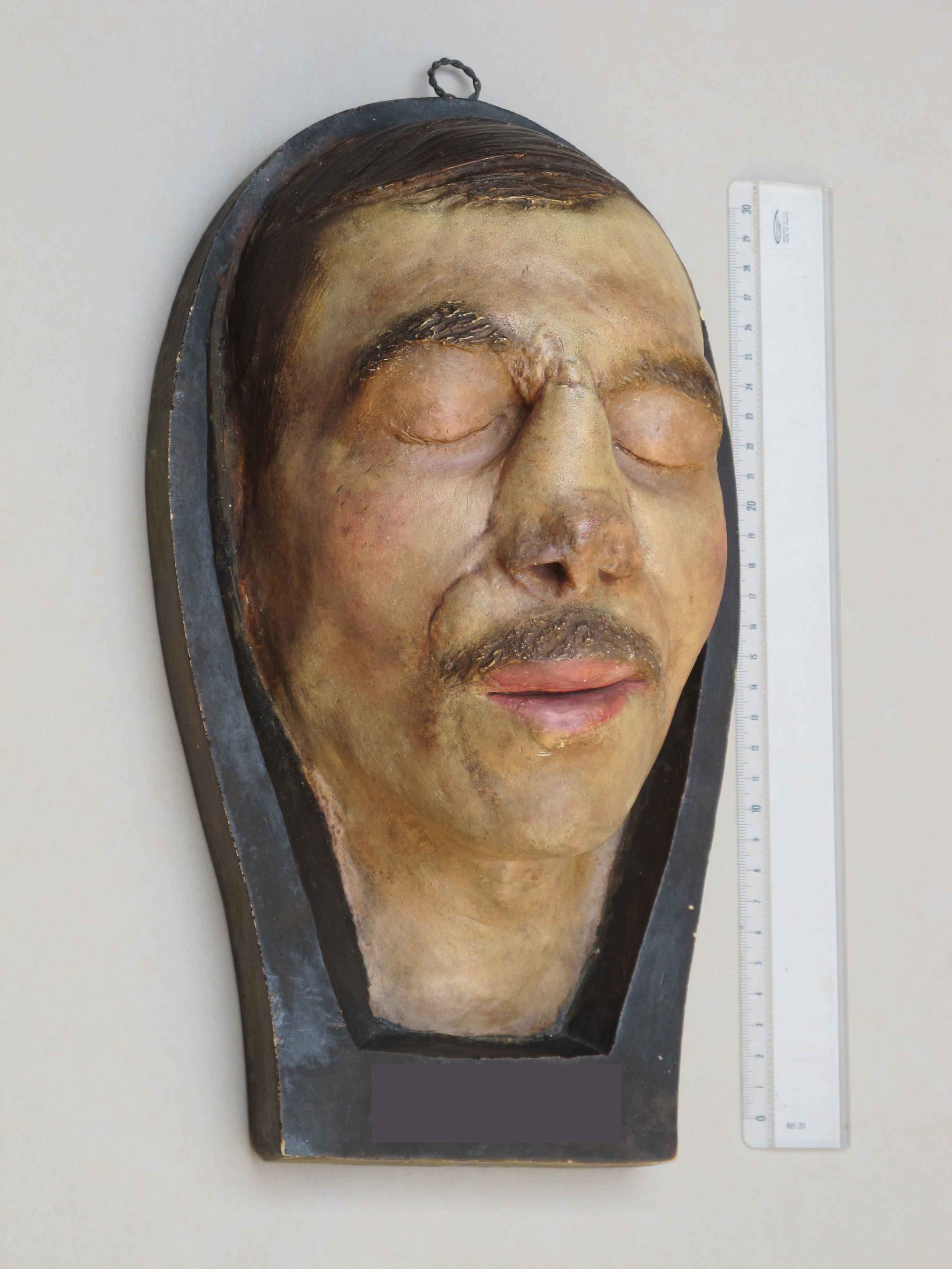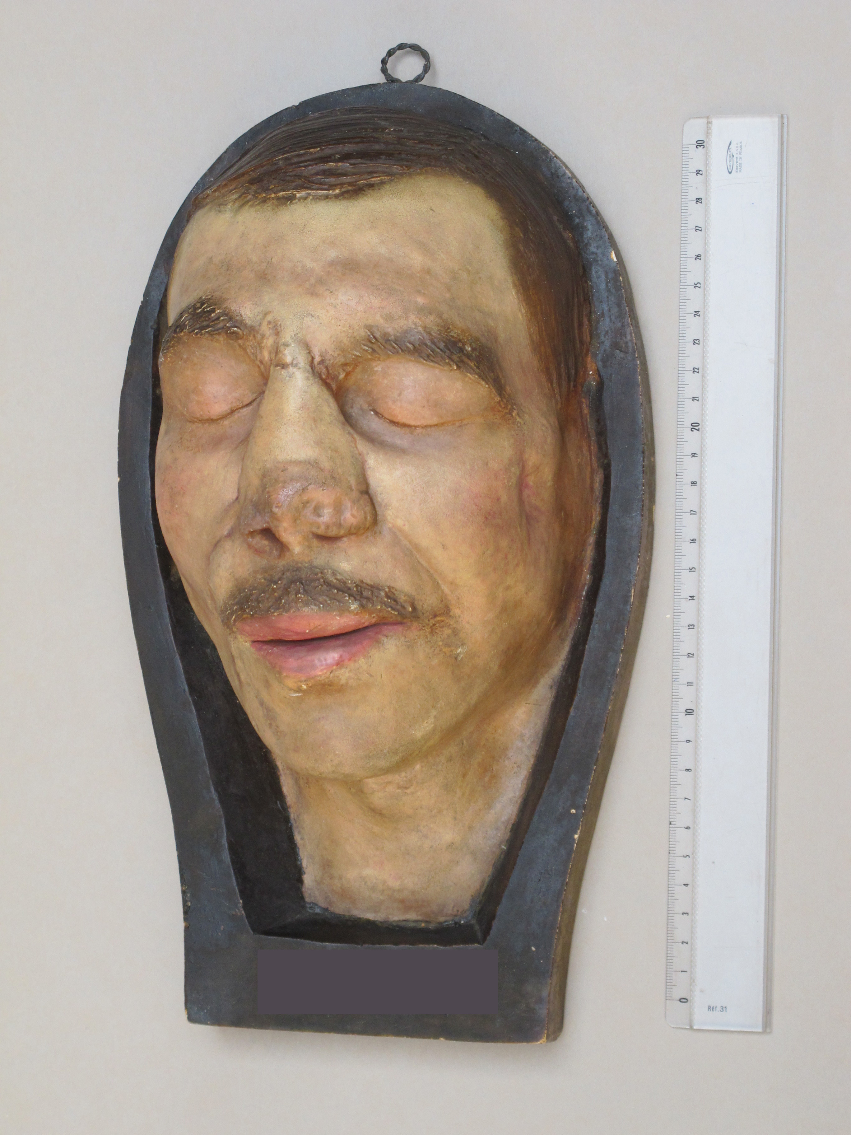 [Moulage d'un visage d'homme traumatisé de la face après pose de lambeau pour rhinoplastie.]