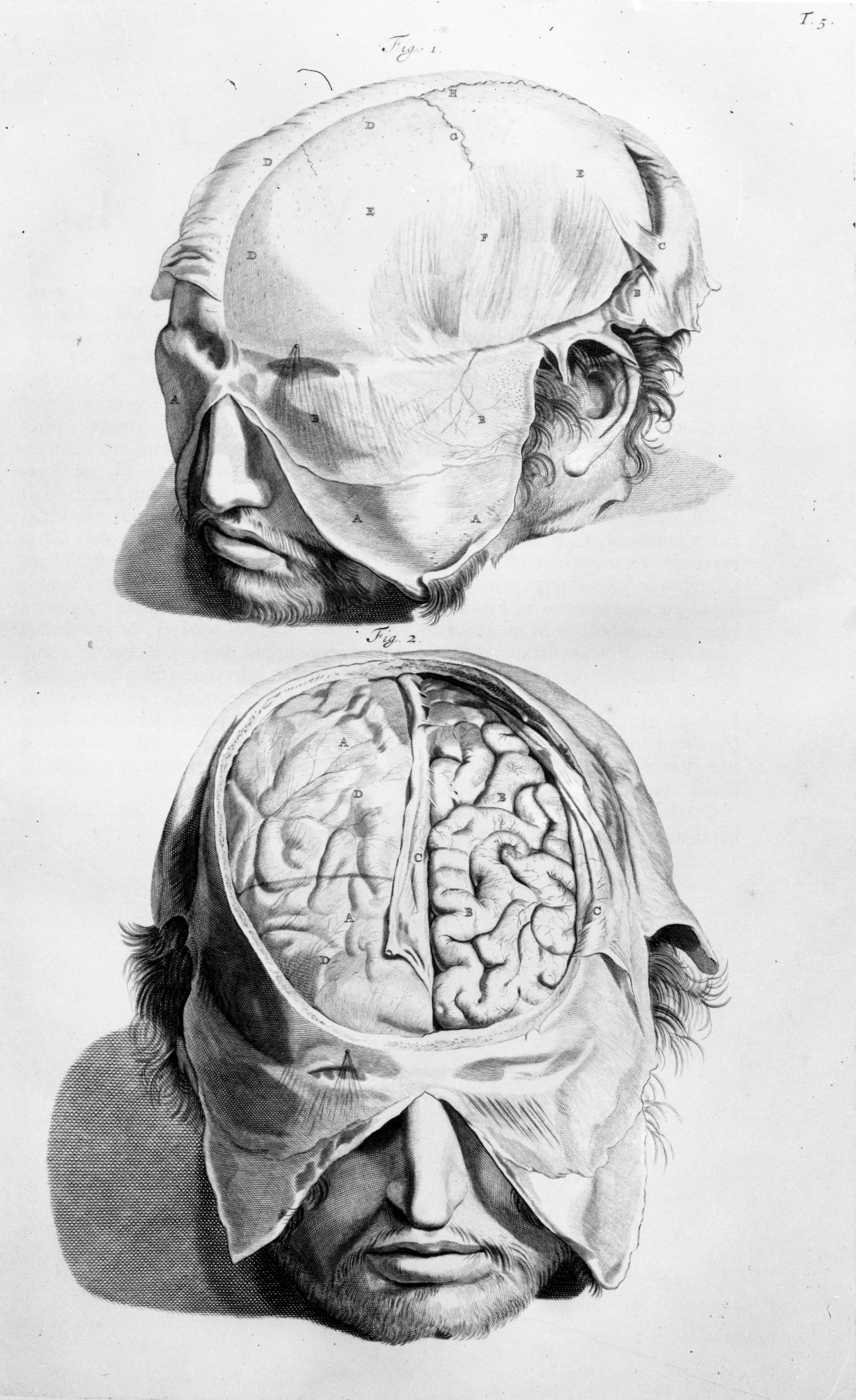Fig. 1. Primum capitis proprium integumentum pericranium / Fig. 2. Cerebrum in naturali suo situ