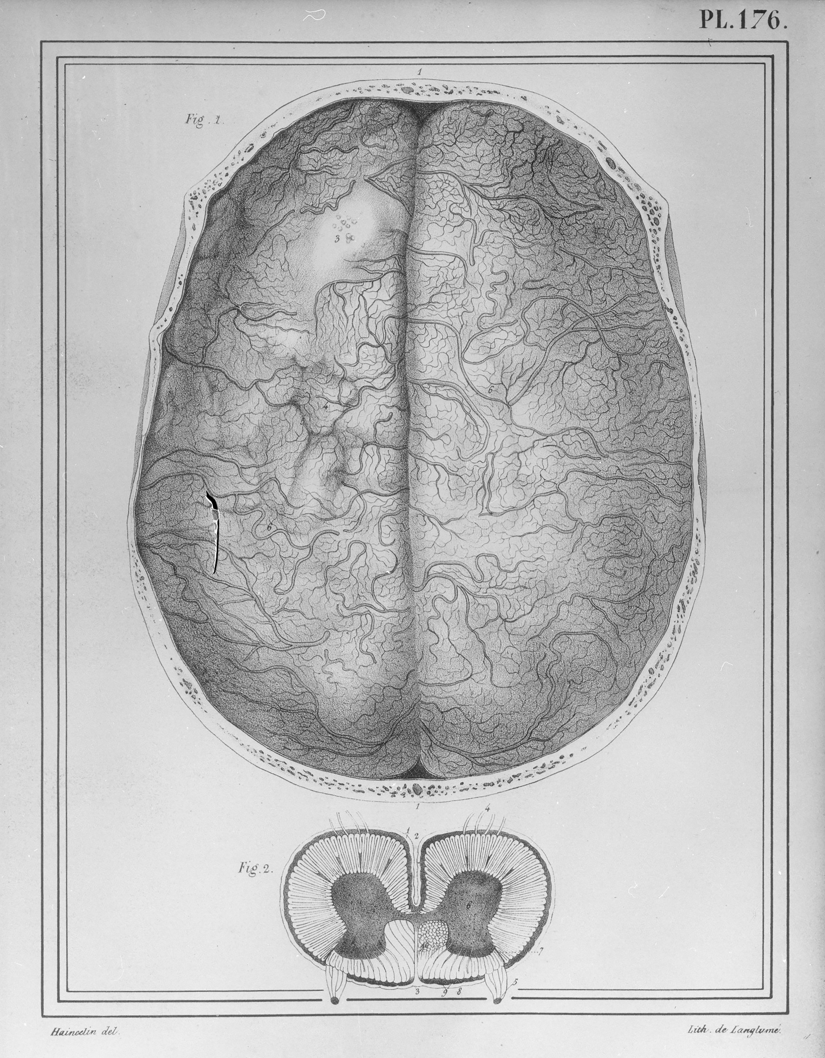 [Coupe transversale du crâne, section transversale de la moelle épinière d'un boeuf]