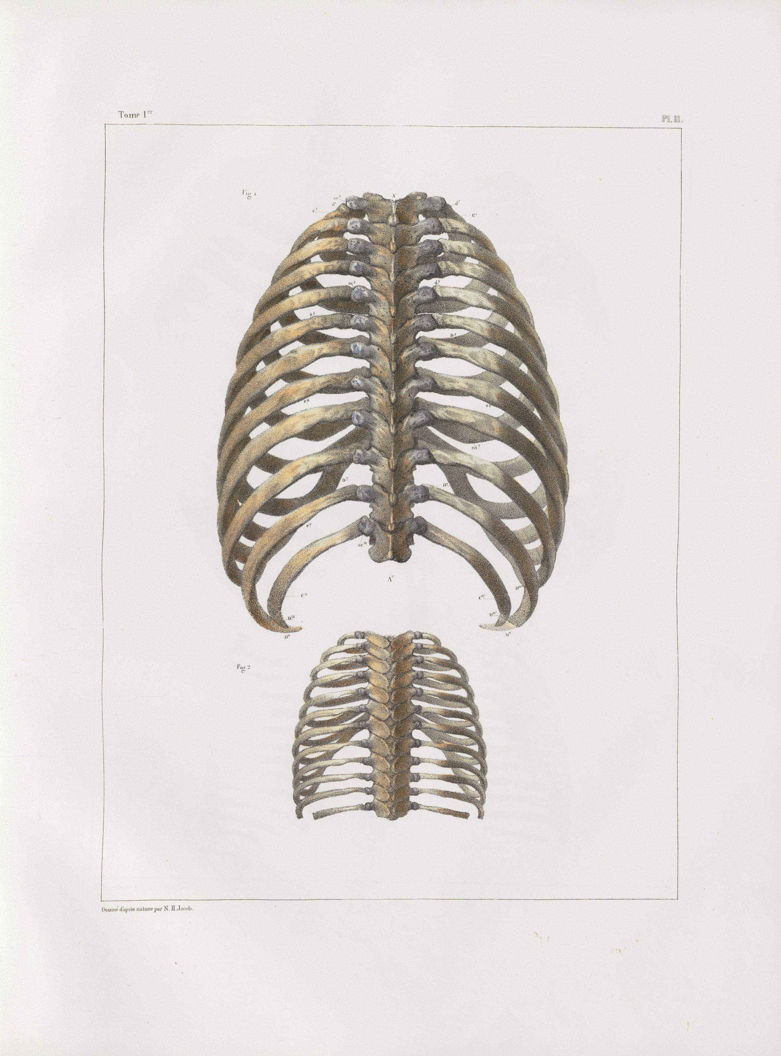 Planche 11 - Thorax, assemblages de côtes et sternum - plan postérieur - Traité complet de l'anatomie de l'homme, par les Drs Bourgery et Claude Bernard et le professeur-dessinateur-anatomiste N.H. Jacob, avec le concours de Ludovic Hirschfeld. Tome Ier.