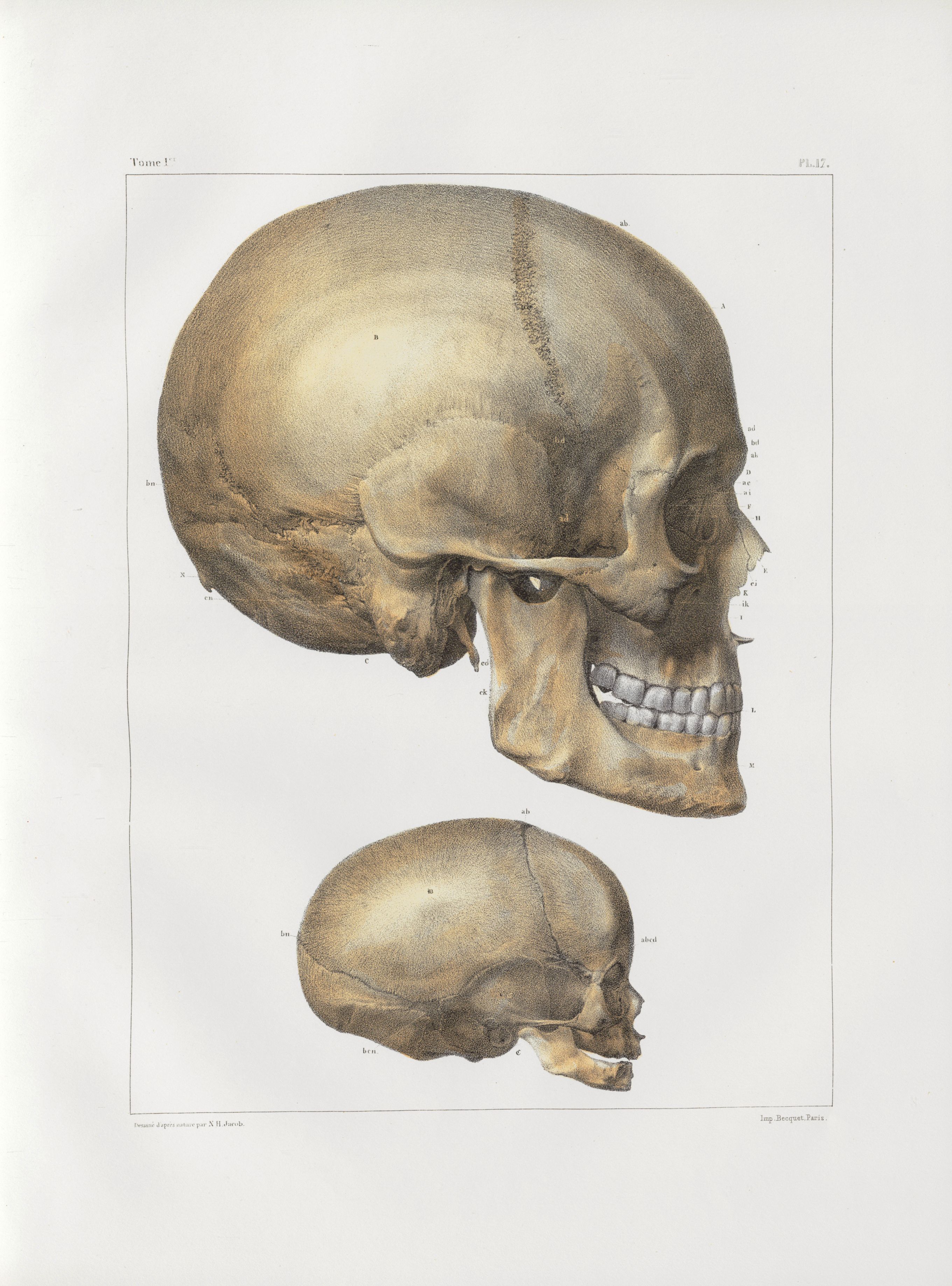 Planche 17 - Têtes - Plan latéral - Traité complet de l'anatomie de l'homme, par les Drs Bourgery et Claude Bernard et le professeur-dessinateur-anatomiste N.H. Jacob, avec le concours de Ludovic Hirschfeld. Tome Ier.