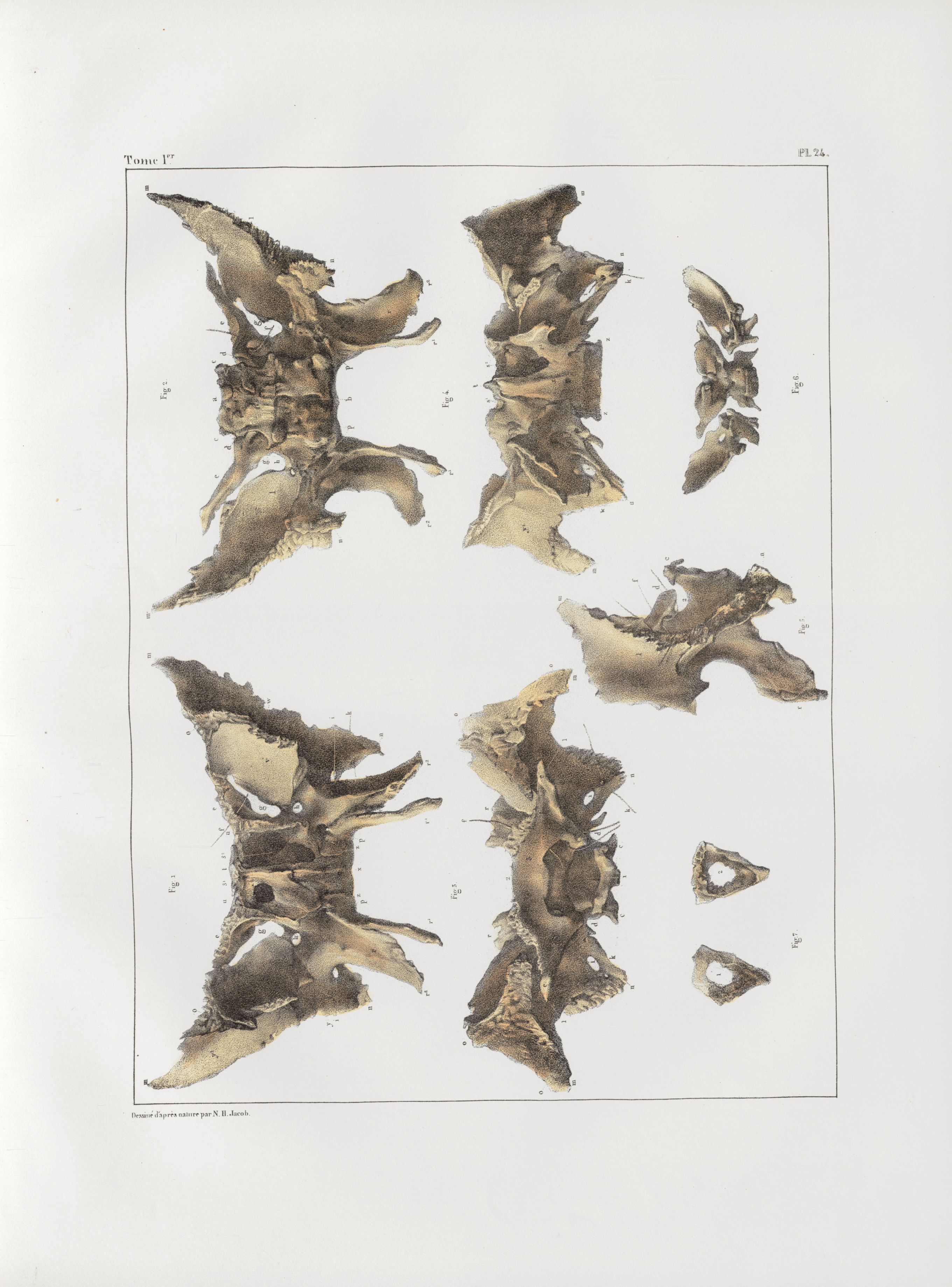 Planche 24 - Os de la tête - Sphénoïde. Adulte et foetus (grandeur naturelle) - Traité complet de l'anatomie de l'homme, par les Drs Bourgery et Claude Bernard et le professeur-dessinateur-anatomiste N.H. Jacob, avec le concours de Ludovic Hirschfeld. Tome Ier.