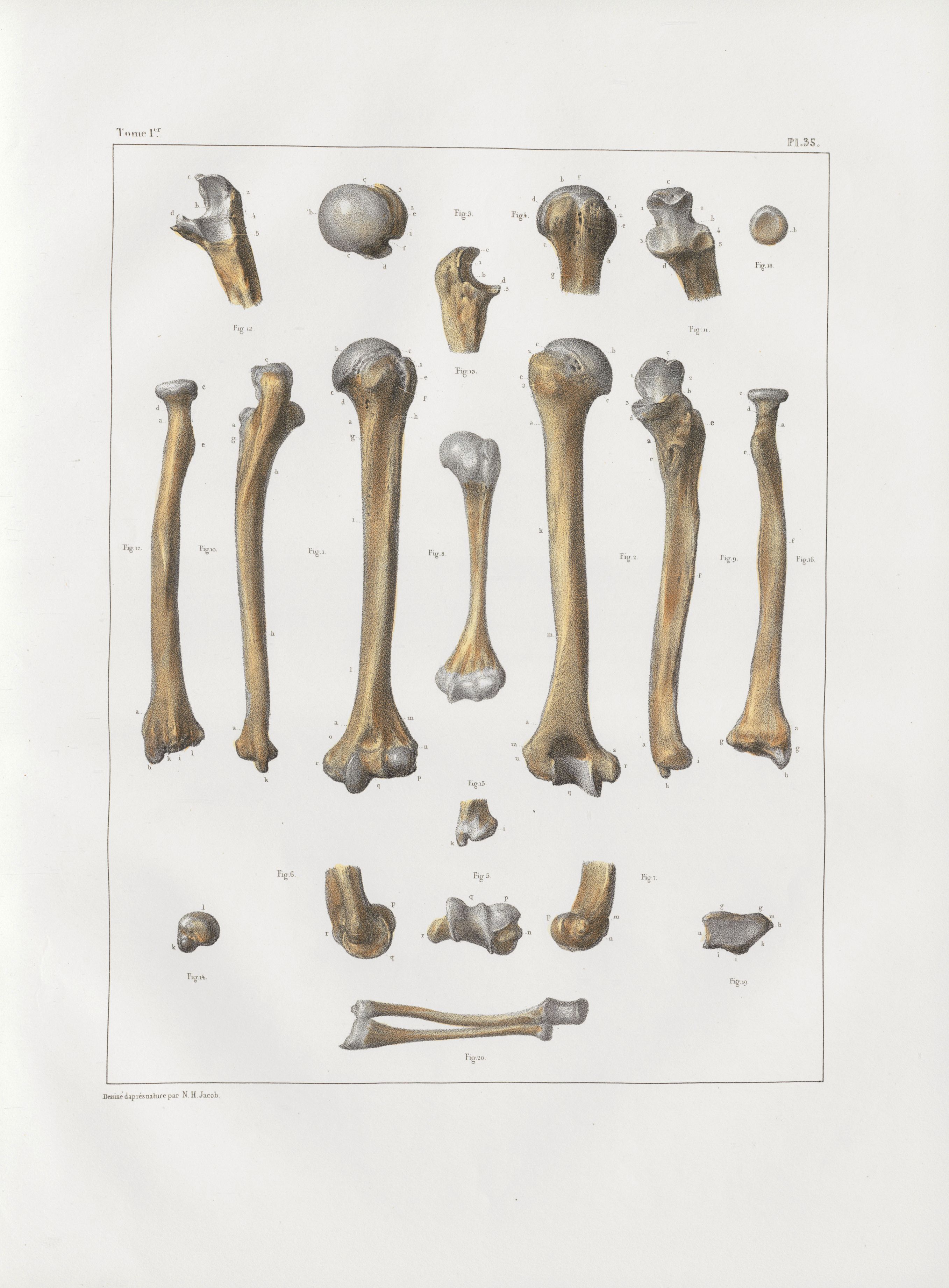 Planche 35 - Humérus, cubitus et radius - Traité complet de l'anatomie de l'homme, par les Drs Bourgery et Claude Bernard et le professeur-dessinateur-anatomiste N.H. Jacob, avec le concours de Ludovic Hirschfeld. Tome Ier.