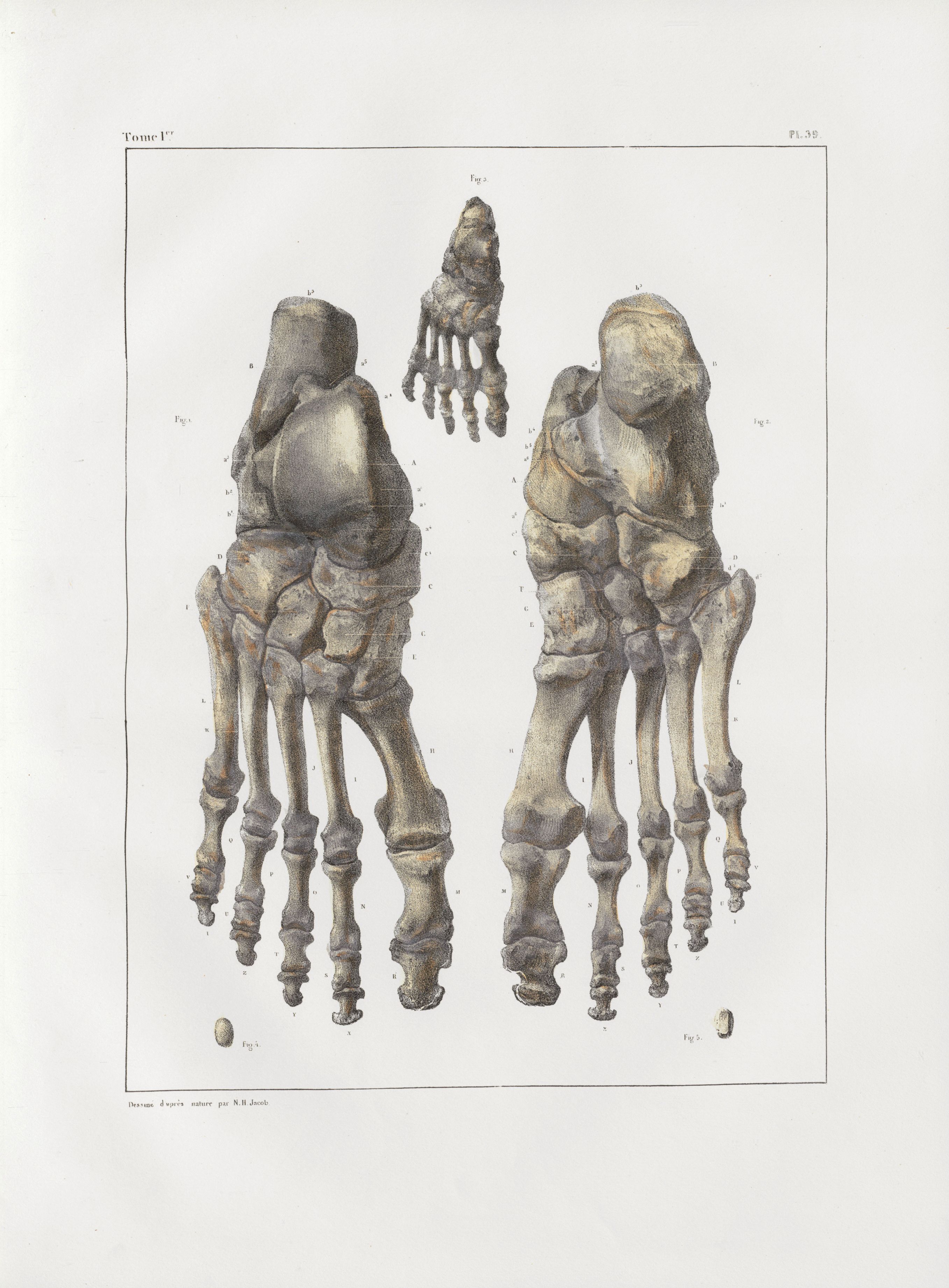 Planche 39 - Pied - Traité complet de l'anatomie de l'homme, par les Drs Bourgery et Claude Bernard et le professeur-dessinateur-anatomiste N.H. Jacob, avec le concours de Ludovic Hirschfeld. Tome Ier.