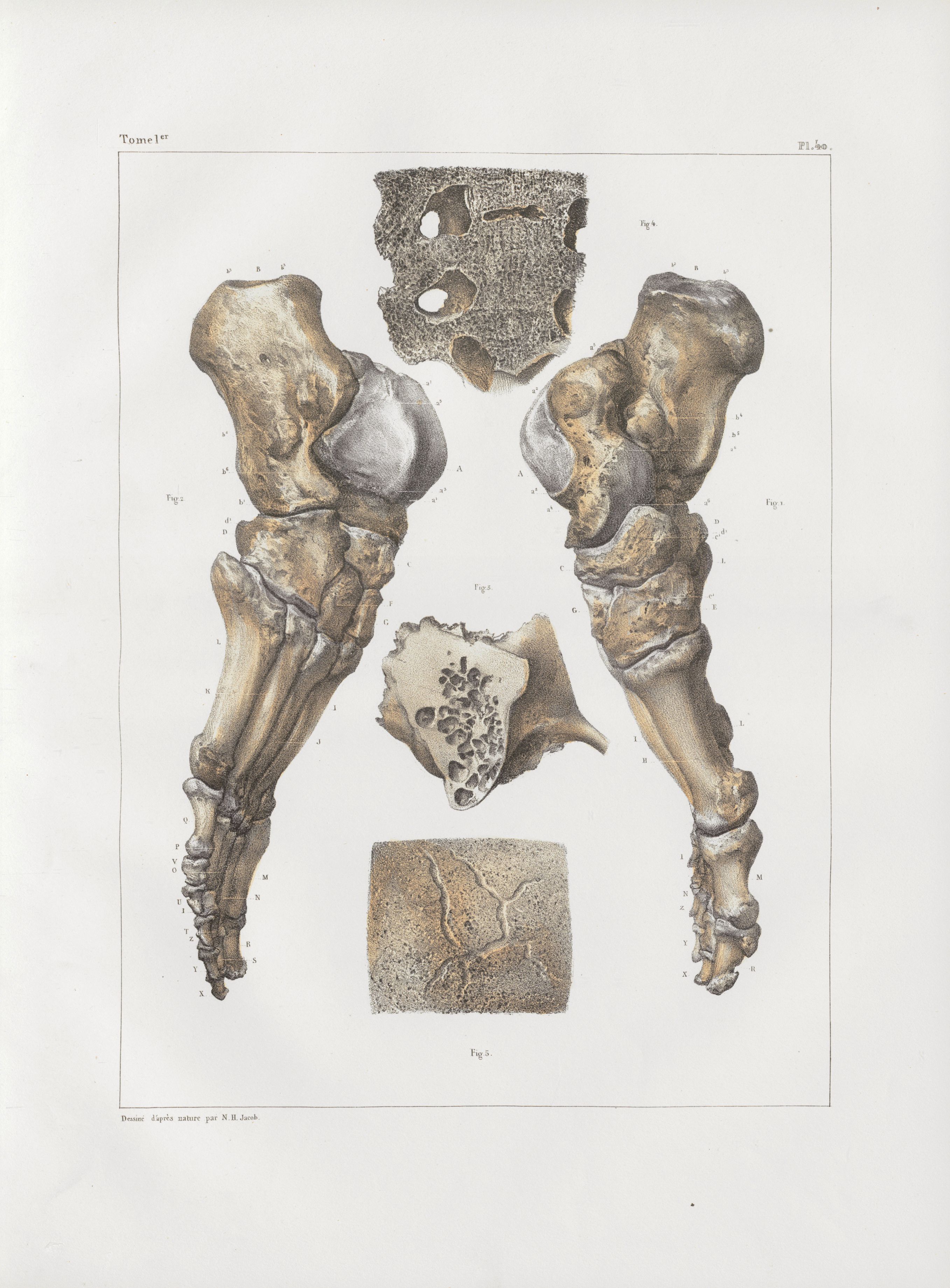 Planche 40 - Pied et détails d'os - Traité complet de l'anatomie de l'homme, par les Drs Bourgery et Claude Bernard et le professeur-dessinateur-anatomiste N.H. Jacob, avec le concours de Ludovic Hirschfeld. Tome Ier.