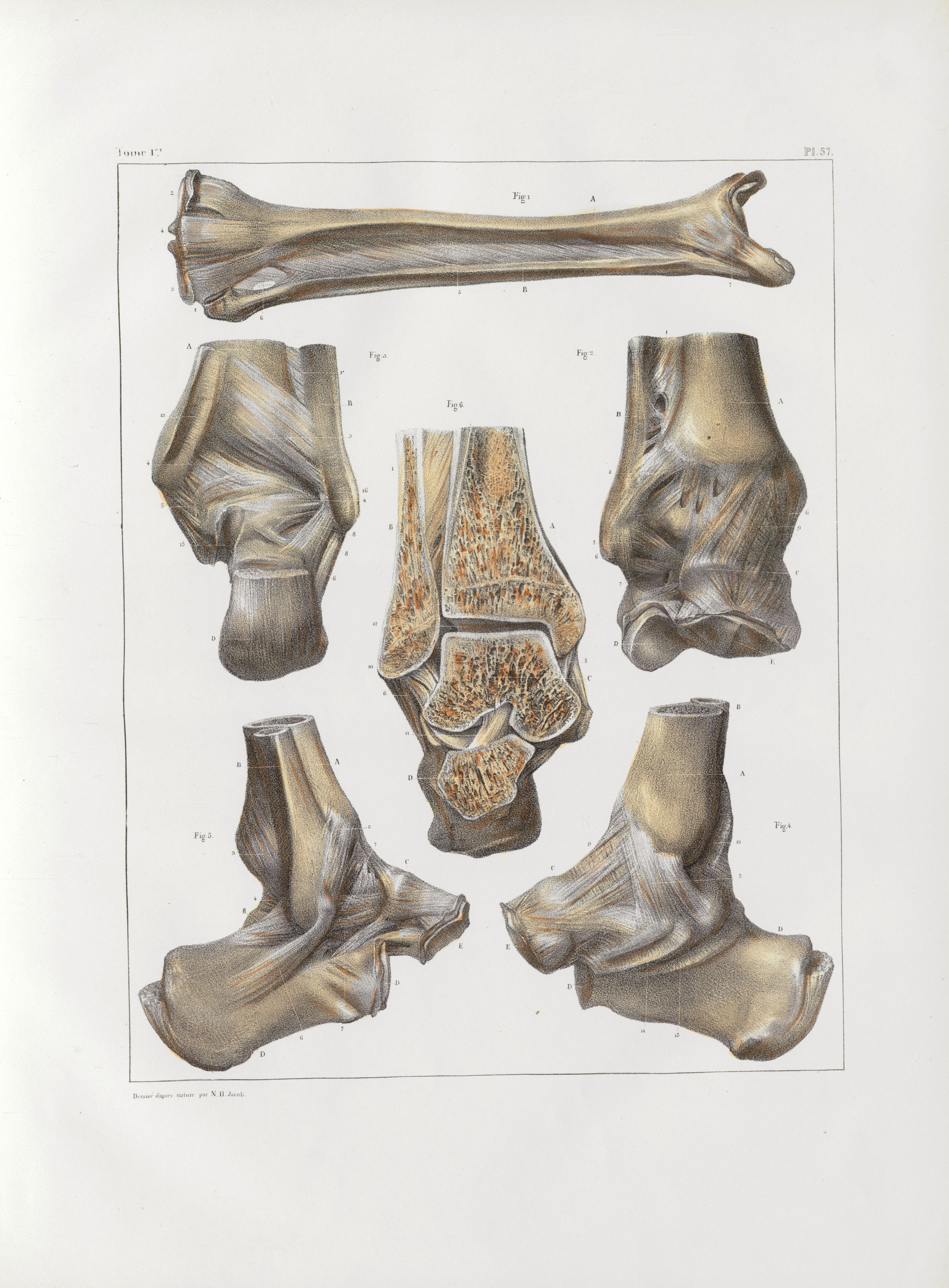 Planche 57 - Articulations péronéo-tibiales, (demi-nature), et tibio-tarsienne, (grandeur naturelle) - Traité complet de l'anatomie de l'homme, par les Drs Bourgery et Claude Bernard et le professeur-dessinateur-anatomiste N.H. Jacob, avec le concours de Ludovic Hirschfeld. Tome Ier.