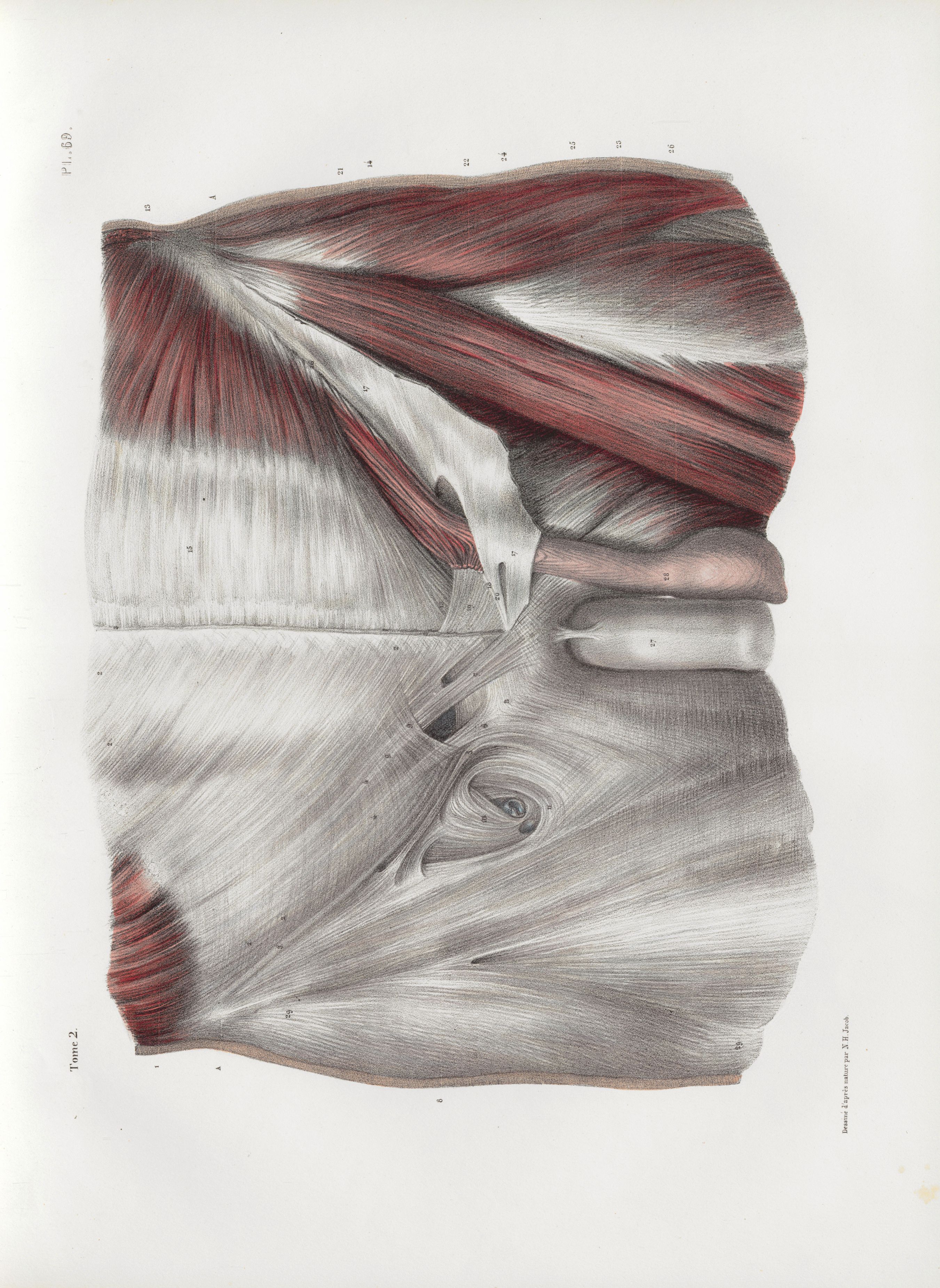 Planche 69 - Muscles - Détails de la partie inférieure des muscles grand et petit obliques, et de leurs rapports avec les aines et la naissance des cuisses - Traité complet de l'anatomie de l'homme, par les Drs Bourgery et Claude Bernard et le professeur-dessinateur-anatomiste N.H. Jacob, avec le concours de Ludovic Hirschfeld. Tome deuxième.