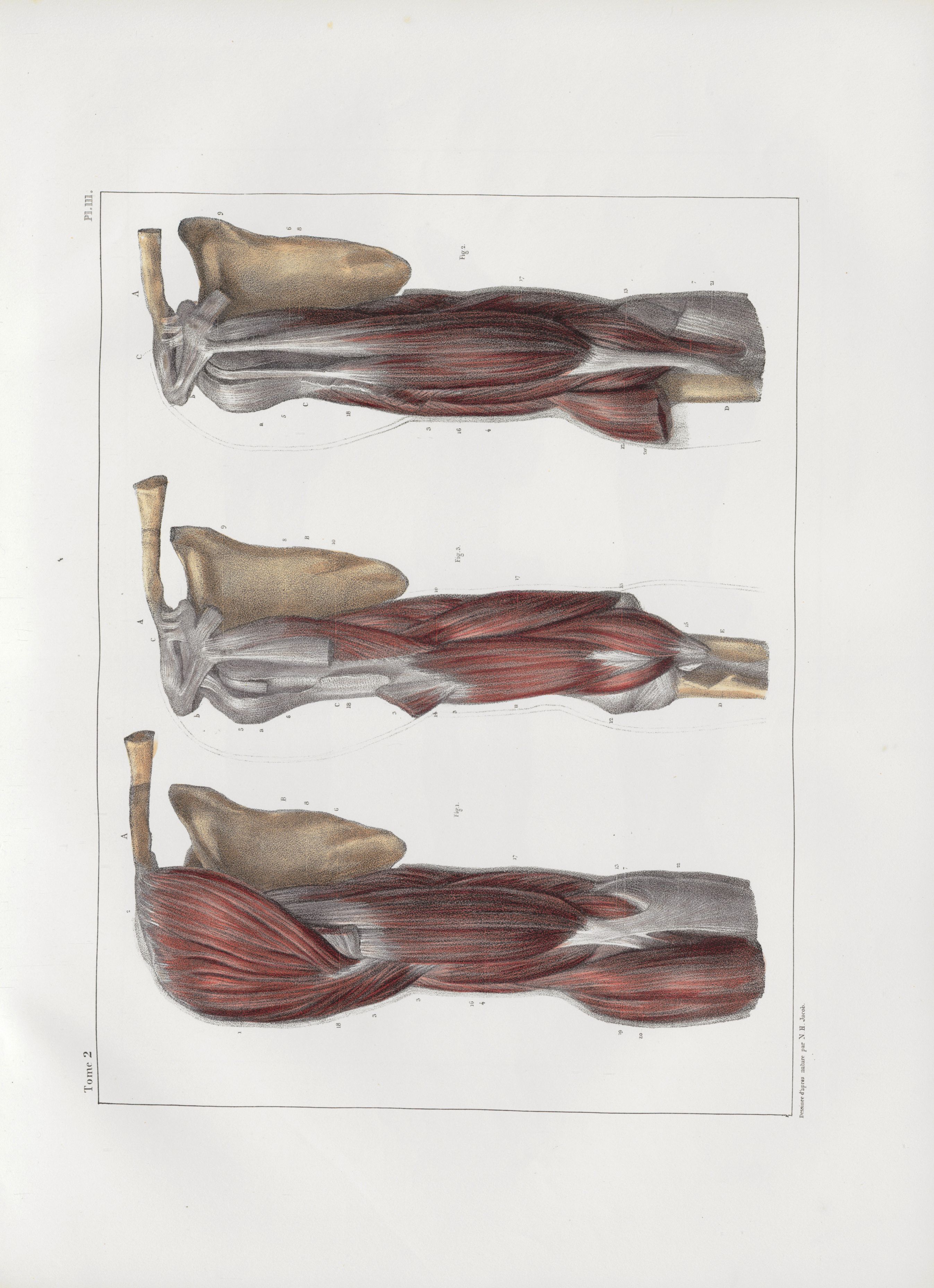Planche 111 - Muscles du bras - Plan antérieur - Deltoïde, biceps, coraco-brachial antérieur, portions latérales du triceps, naissance des muscles de l'avant-bras - Traité complet de l'anatomie de l'homme, par les Drs Bourgery et Claude Bernard et le professeur-dessinateur-anatomiste N.H. Jacob, avec le concours de Ludovic Hirschfeld. Tome deuxième.