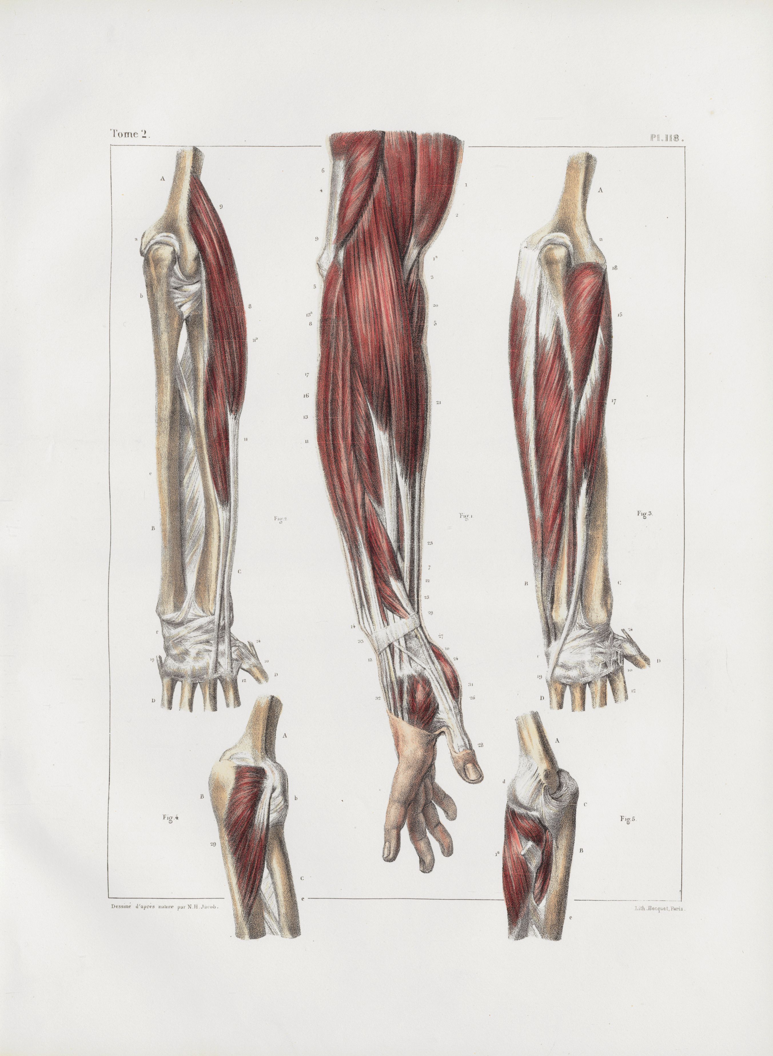 Planche 118 - Muscles de l'avant-bras - Muscles de l'avant-bras à divers plans - Traité complet de l'anatomie de l'homme, par les Drs Bourgery et Claude Bernard et le professeur-dessinateur-anatomiste N.H. Jacob, avec le concours de Ludovic Hirschfeld. Tome deuxième.