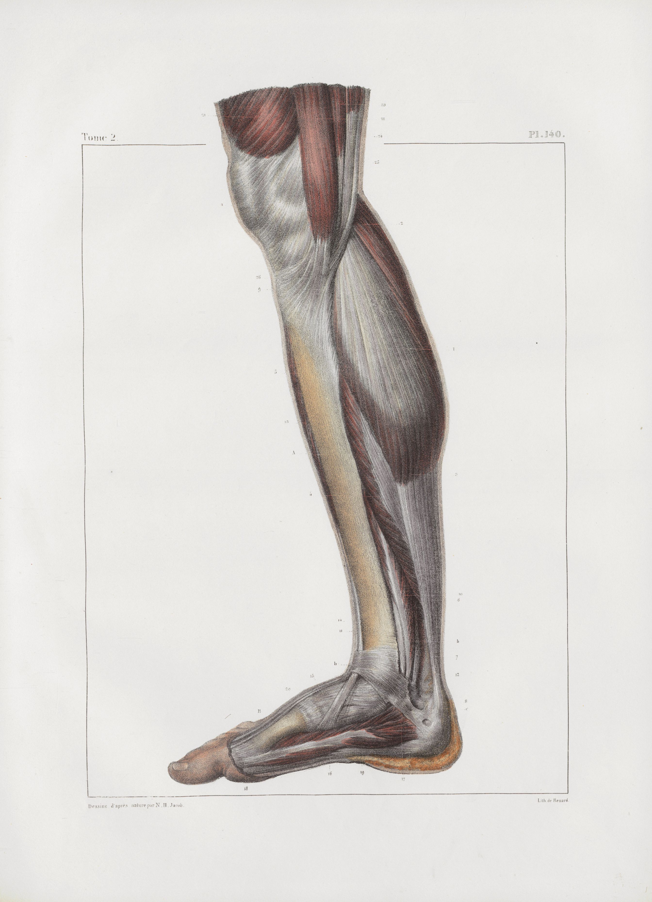 Planche 140 - Muscles de la jambe - Plan interne - Muscles jumeau interne, soléaire, partie du long fléchisseur commun des orteils, du long fléchisseur propre du gros orteil et des jambiers antérieur et postérieur. - Au pied : adducteur du gros orteil. - A la cuisse : extrémité inférieure des vaste interne, couturier, droit interne, demi-tendineux et demi-membraneux - Traité complet de l'anatomie de l'homme, par les Drs Bourgery et Claude Bernard et le professeur-dessinateur-anatomiste N.H. Jacob, avec le concours de Ludovic Hirschfeld. Tome deuxième.