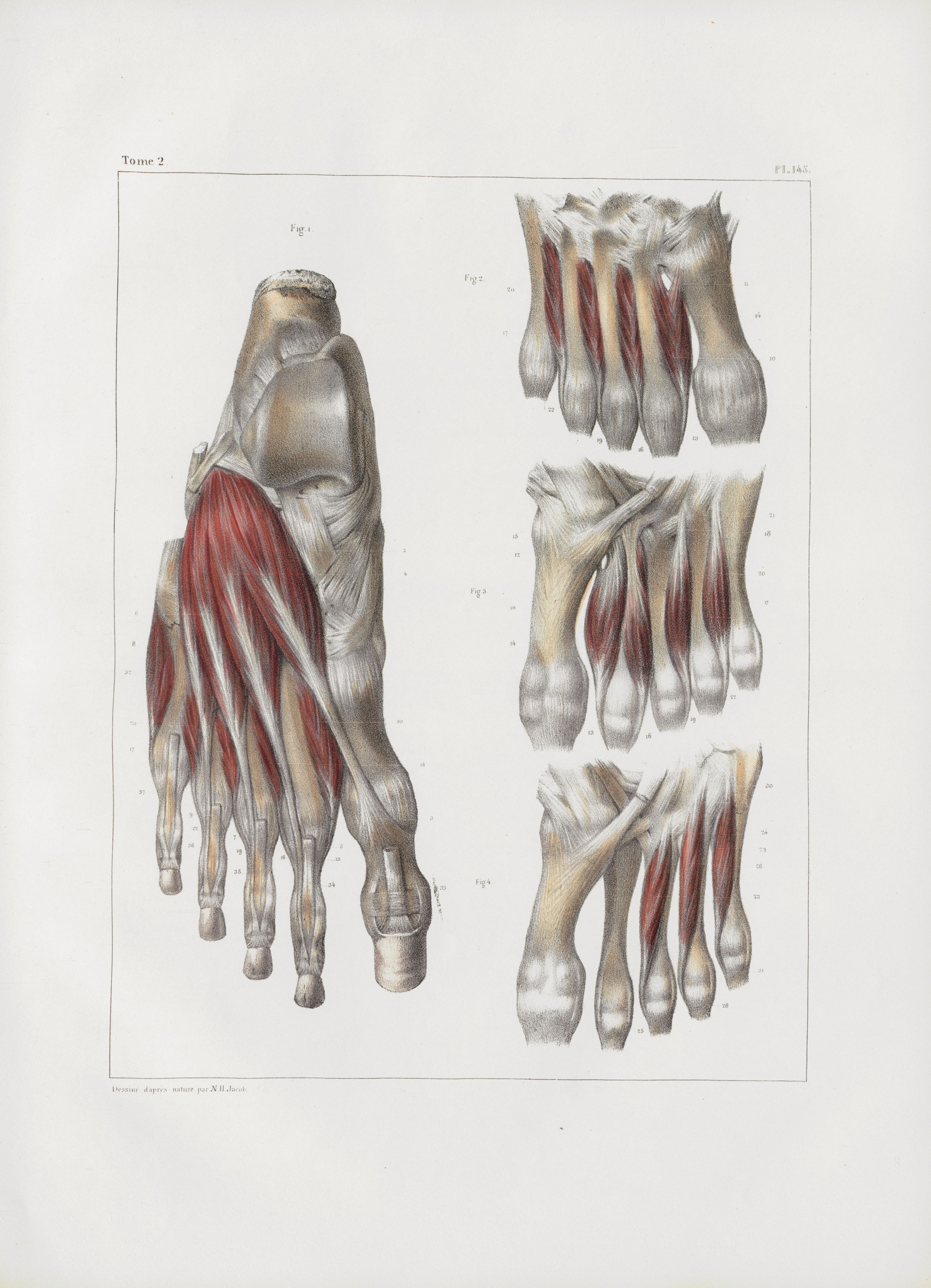 Planche 145 - Muscles du pied - Plans profonds, dorsal et plantaire - Traité complet de l'anatomie de l'homme, par les Drs Bourgery et Claude Bernard et le professeur-dessinateur-anatomiste N.H. Jacob, avec le concours de Ludovic Hirschfeld. Tome deuxième.