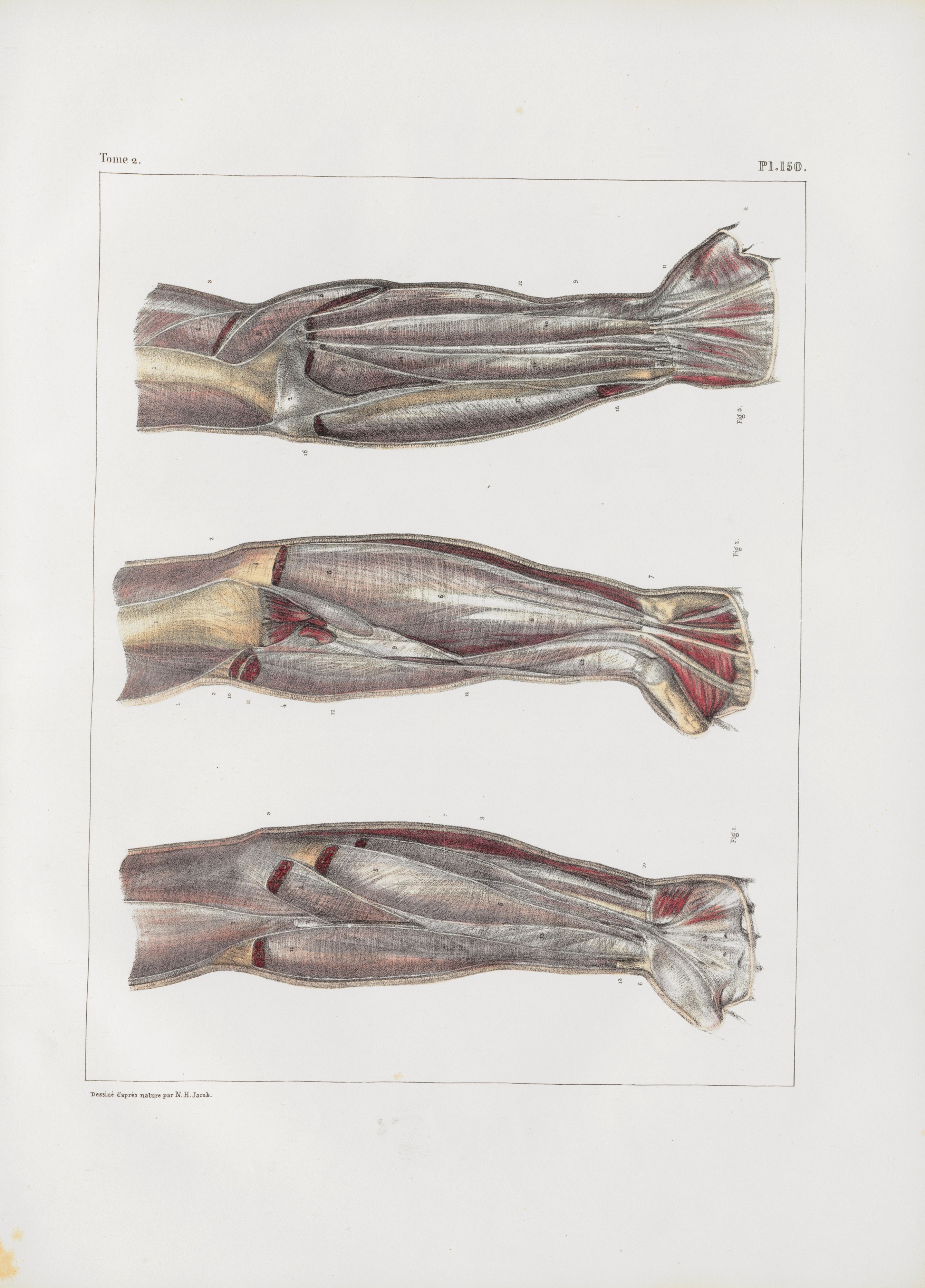 Planche 150 - Loges et cloisons aponévrotiques des muscles du bras et de l'avant-bras - Traité complet de l'anatomie de l'homme, par les Drs Bourgery et Claude Bernard et le professeur-dessinateur-anatomiste N.H. Jacob, avec le concours de Ludovic Hirschfeld. Tome deuxième.